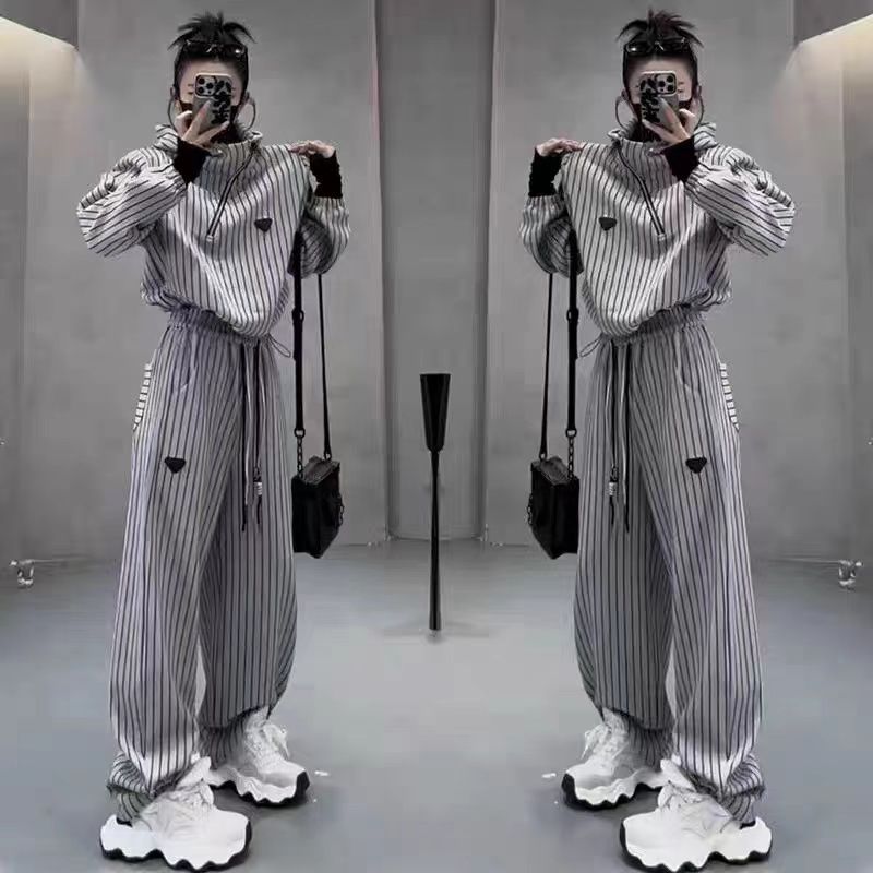 Conjunto de dos piezas de sudadera con capucha y pantalones largos a rayas, holgado, adelgazante, primavera y otoño de 2024 para mujer