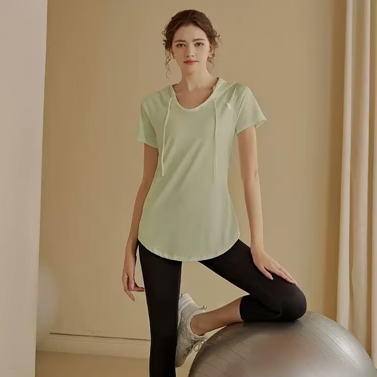 Camiseta deportiva de manga corta para mujer, holgada, adelgazante, de longitud media, con capucha, de secado rápido, para fitness y yoga.