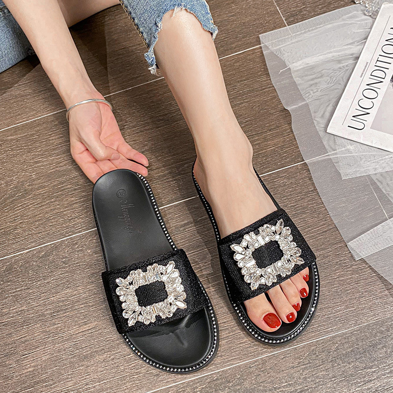 2025 verano nuevo lazo con diamantes de imitación hebilla cuadrada plana casual zapatillas de mujer sandalias de una tira para mujer ropa de exterior talla grande 41