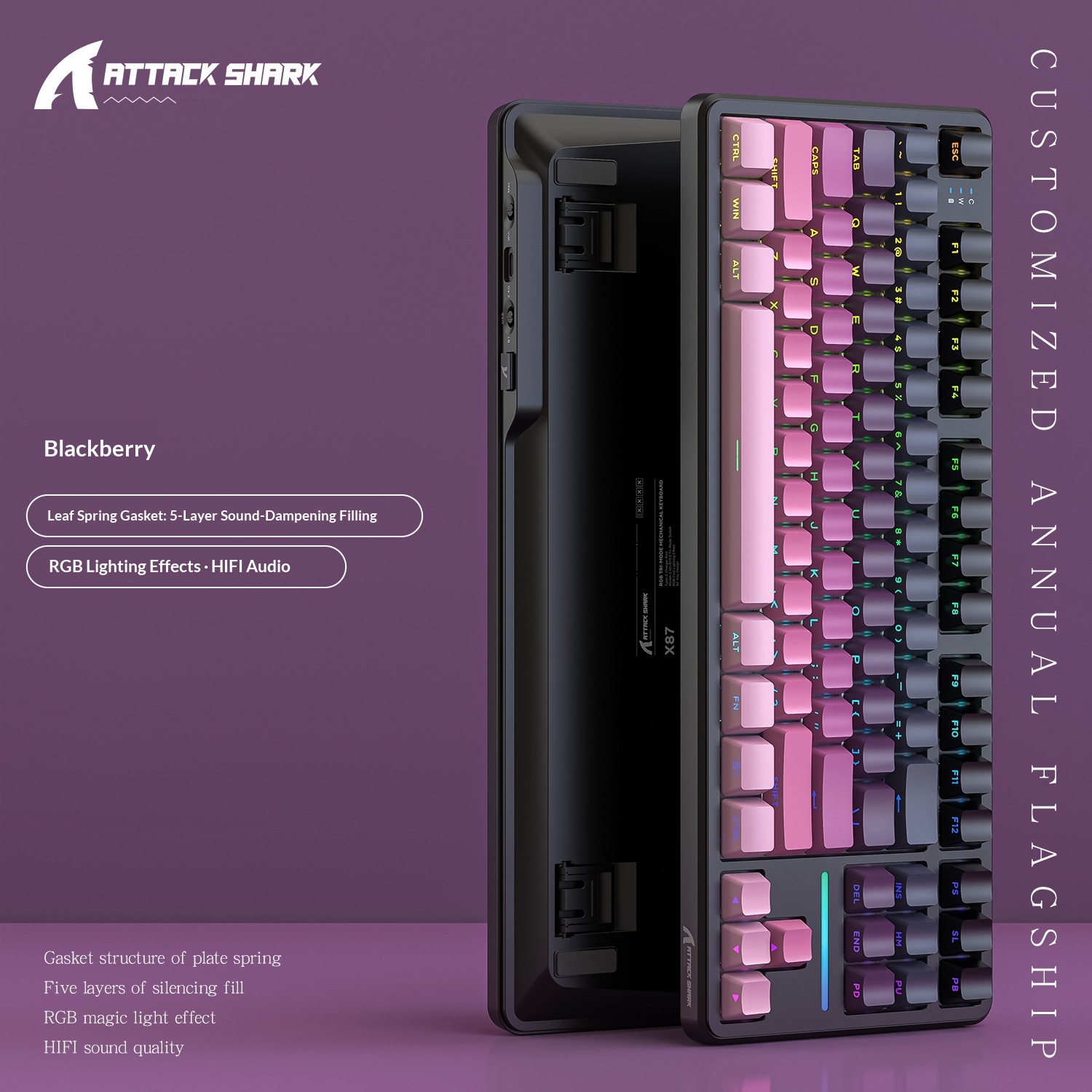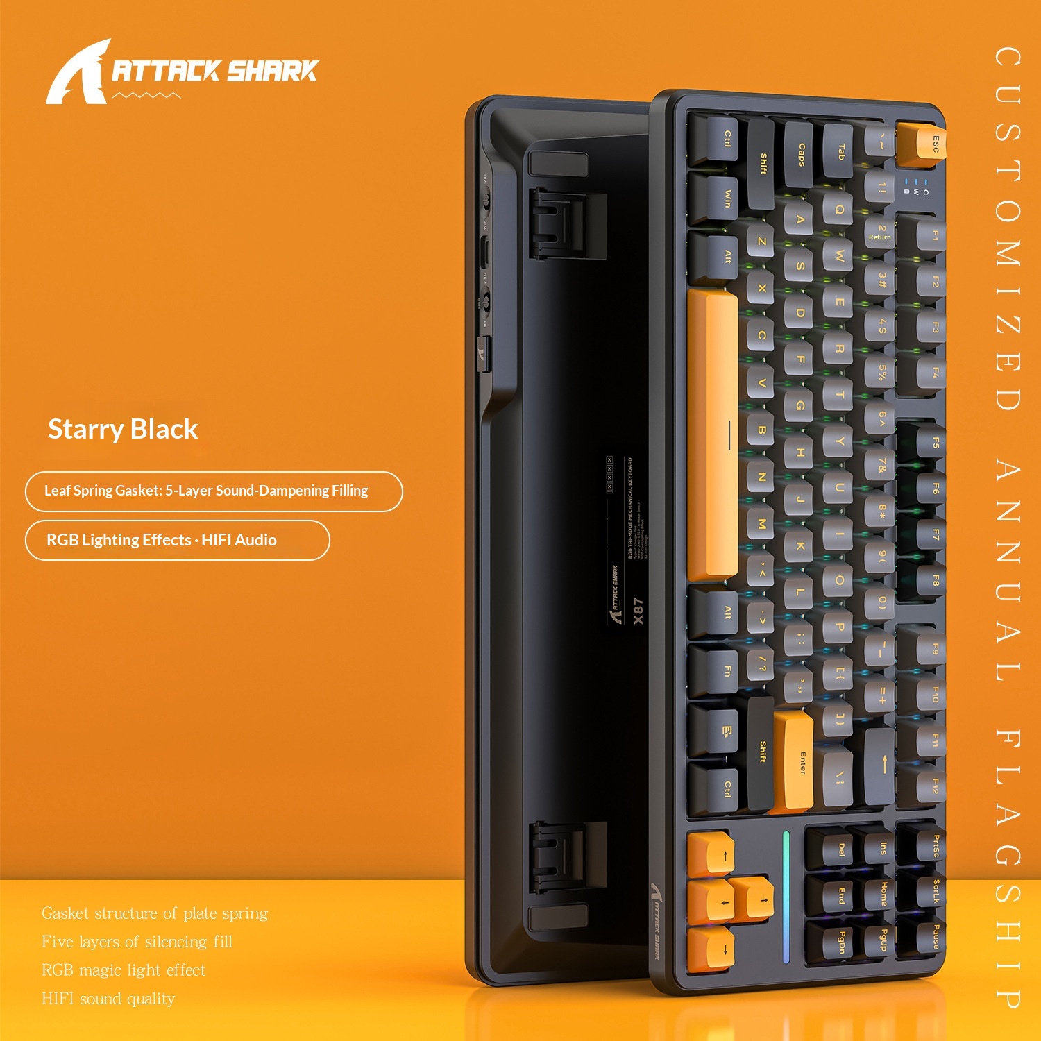 Teclado mecánico inalámbrico Attack Shark X87 con Bluetooth, triple modo, junta personalizable y grabado lateral para juegos.