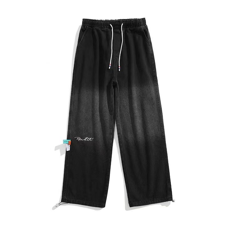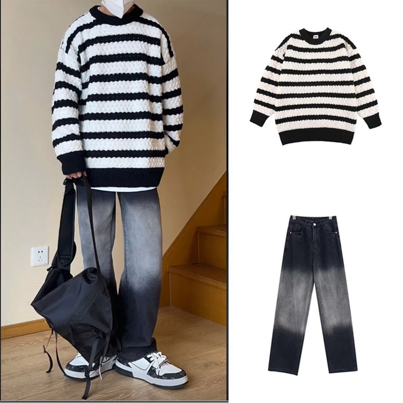 【 Quick Refund 】 Autumn and Winter Casual Stripe Sweater Trendy Knitted Set Paired with Straight Washed Gradient Jeans for Men's Wear