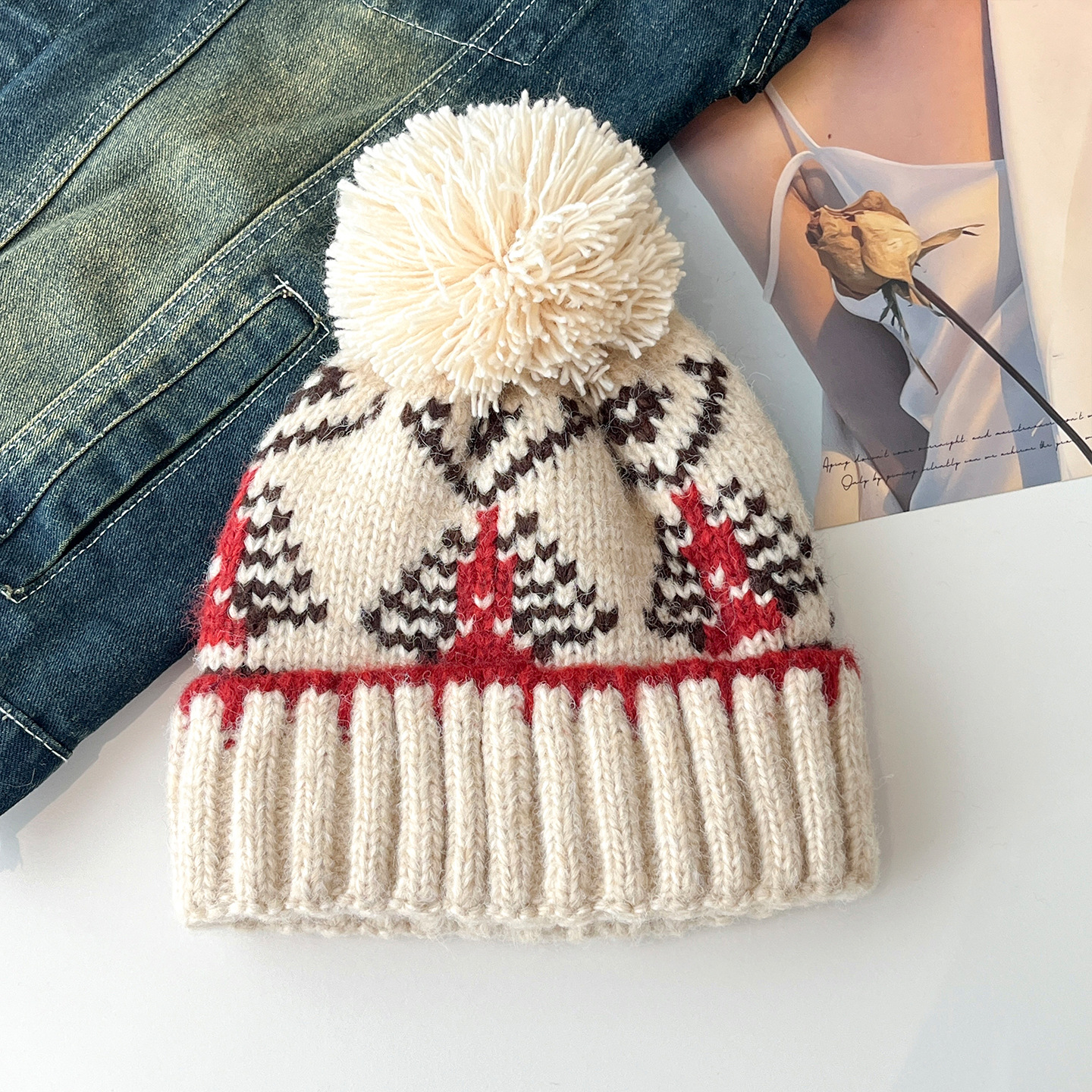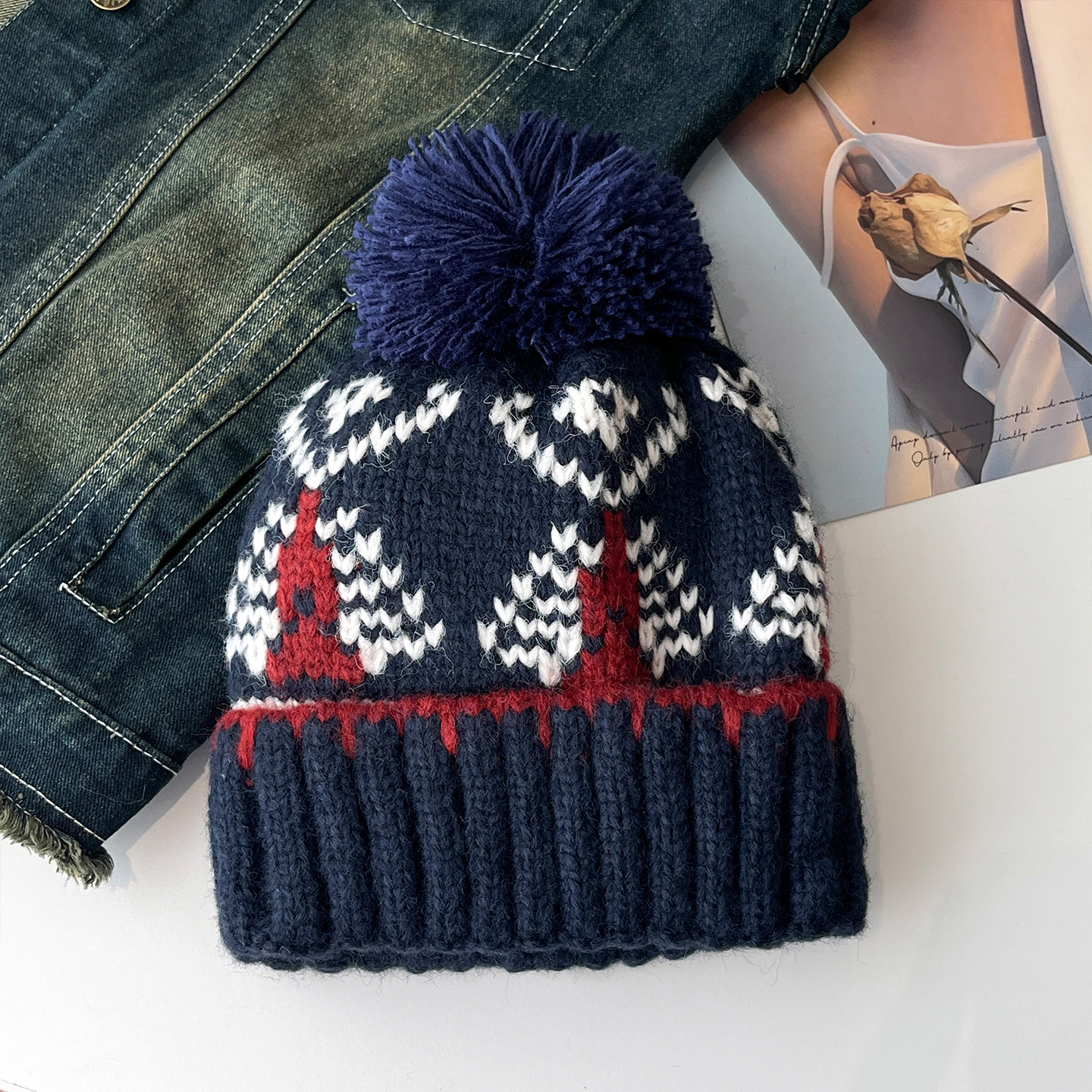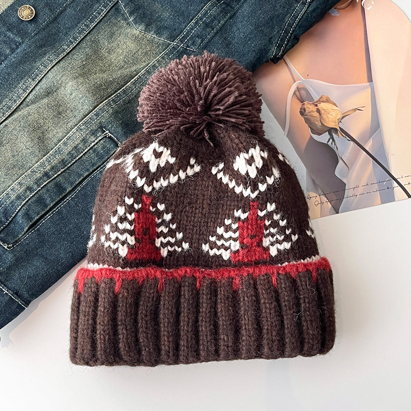 Autumn Winter Korean Retro Jacquard Knitted Hat for Women Winter Fair Isle Style Ear Protection Warm Pom Pom Knitted Pullover Hat