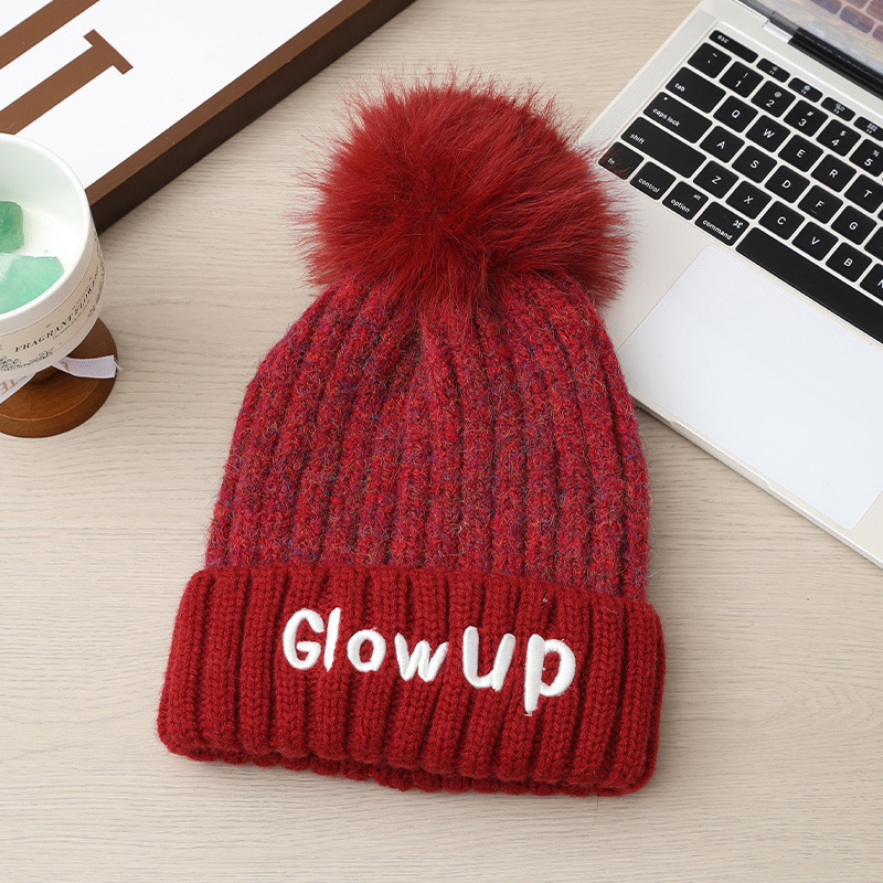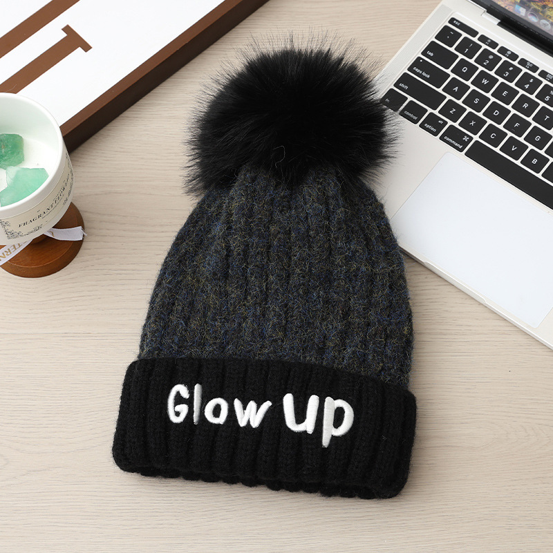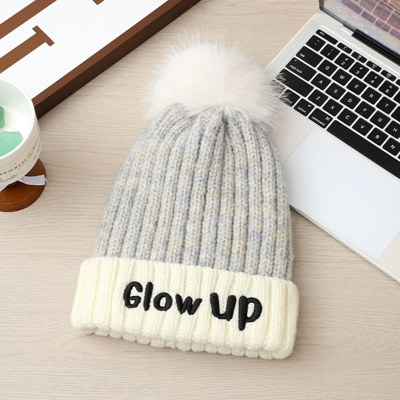Autumn Winter English Letter Embroidered Knitted Wool Versatile Cute Pom Warm Outdoor Cold-Proof Pullover Hat Korean