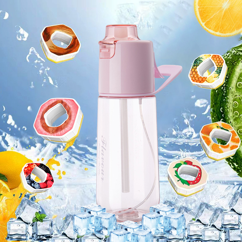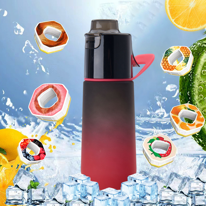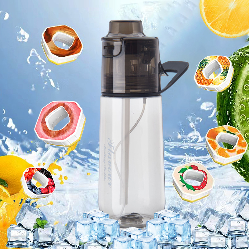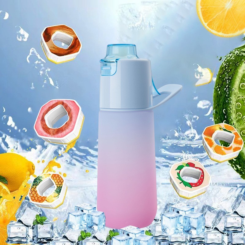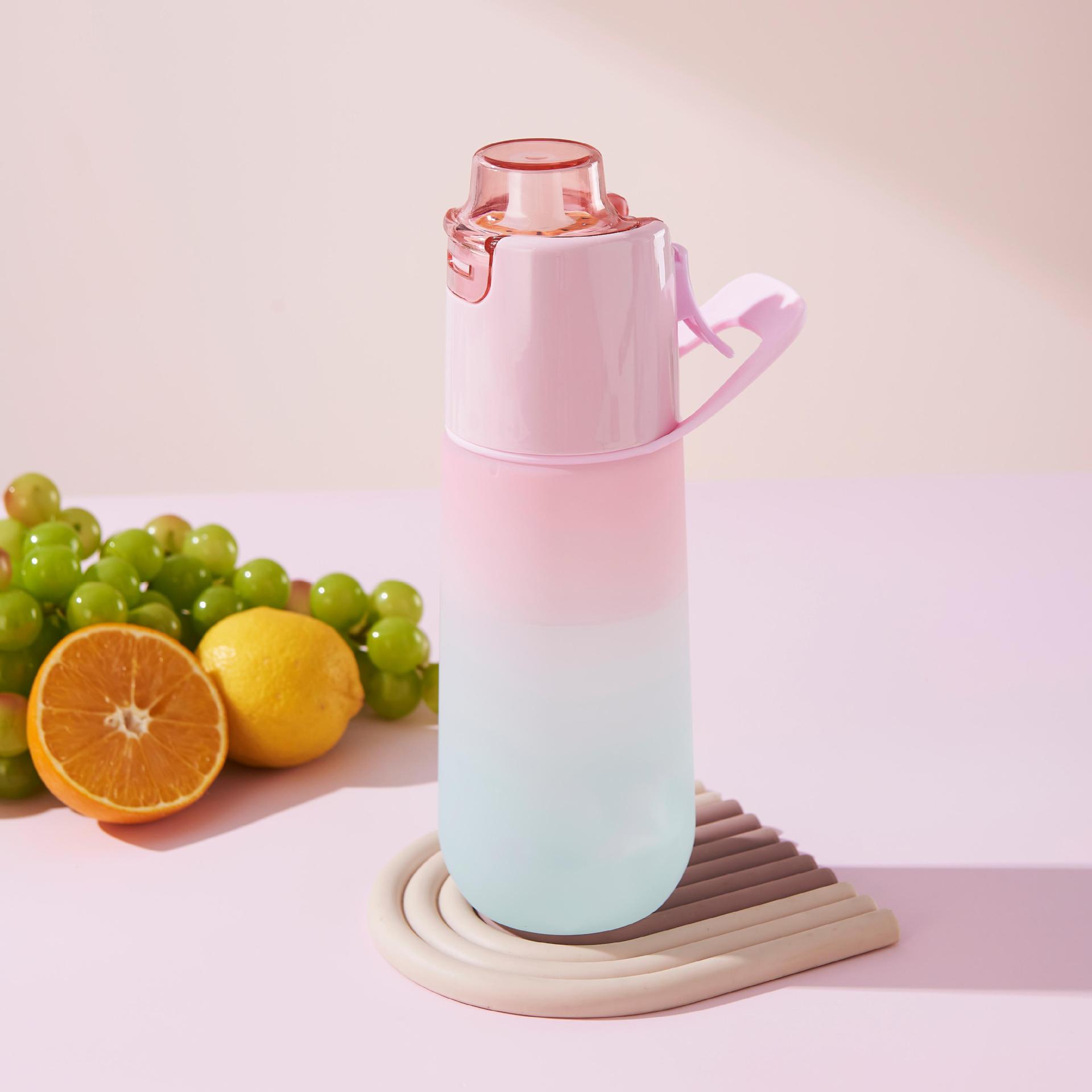 Nueva botella de agua bicolor con función de pulverización y aroma a frutas. Un moderno accesorio para beber agua. Vaso con pulverizador de fragancia.