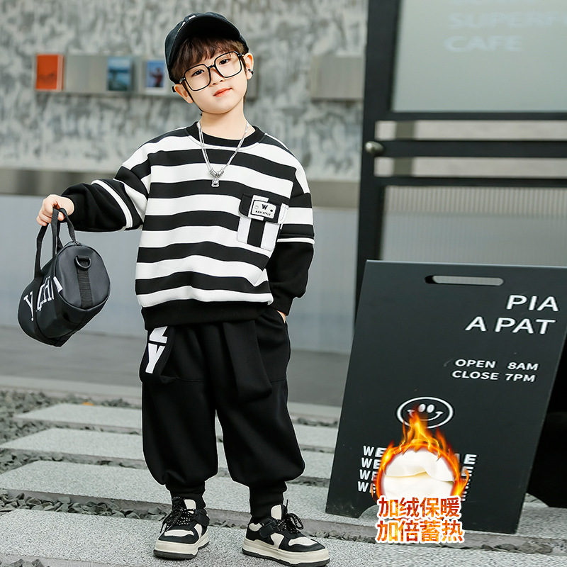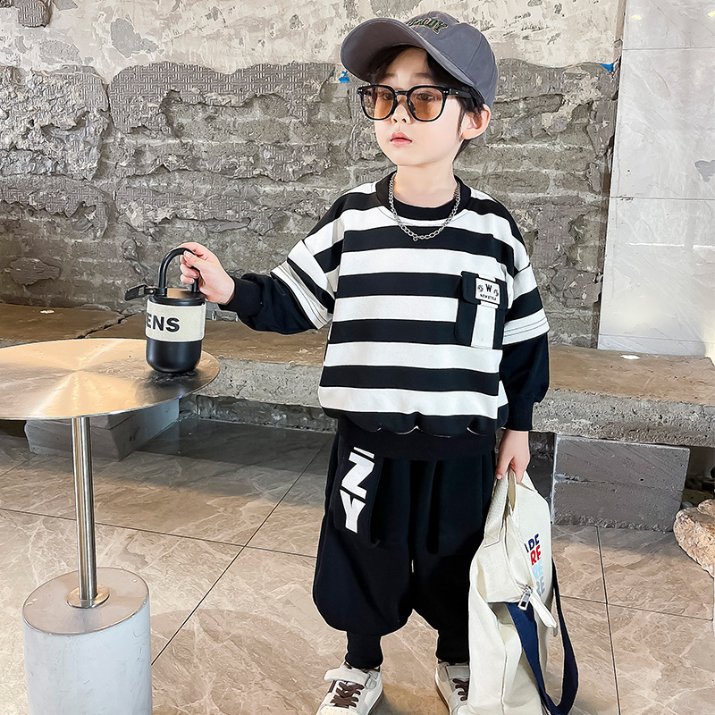 Boys' striped sweaters, boots and pants set, spring and autumn clothing, new children's trendy cool two-piece set, children's clothing