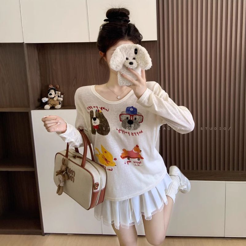 Apricot cartoon printed long sleeved T-shirt for women with a lazy early autumn style, thin and loose casual fit, with a round neck top and cotton softness