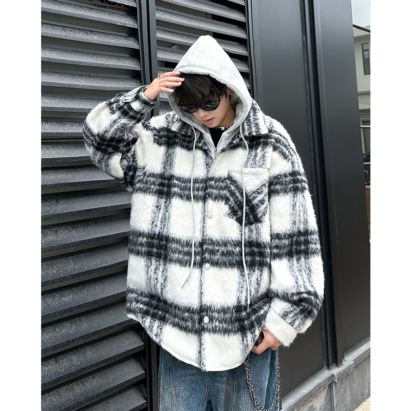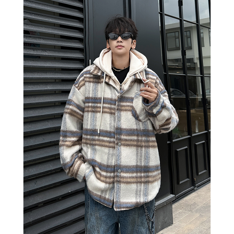 Chaqueta de lana a cuadros Xiaoxiangfeng para hombre, chaqueta informal con capucha estilo universitario, holgada, de moda de invierno