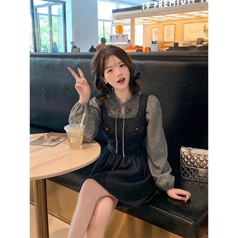 Conjunto vaquero dulce de estilo francés ChicShe para mujer, camisa otoñal de lunares con cordones, vestido de tirantes sexy vintage lavado