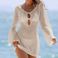 Vestido corto de playa con escote en V, manga larga y textura hueca para mujer, protector solar, sin espalda