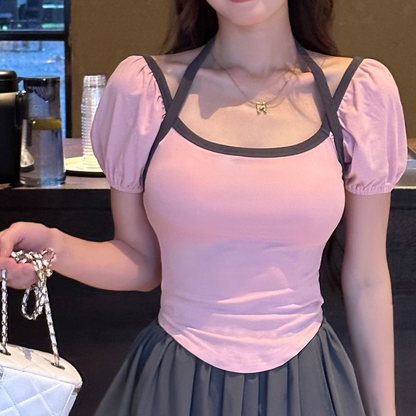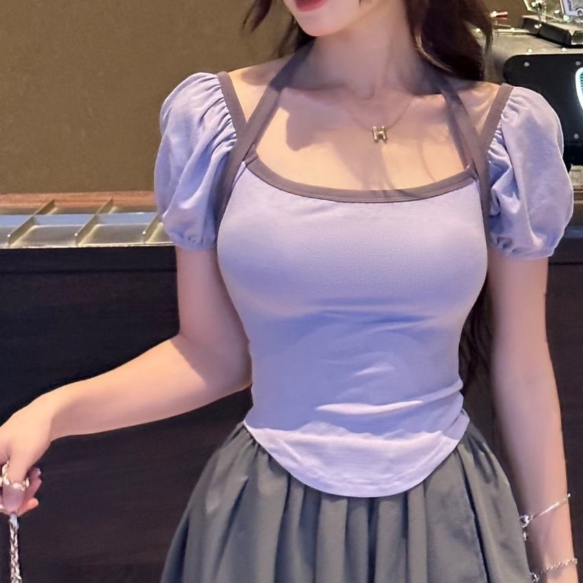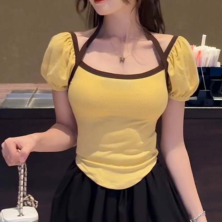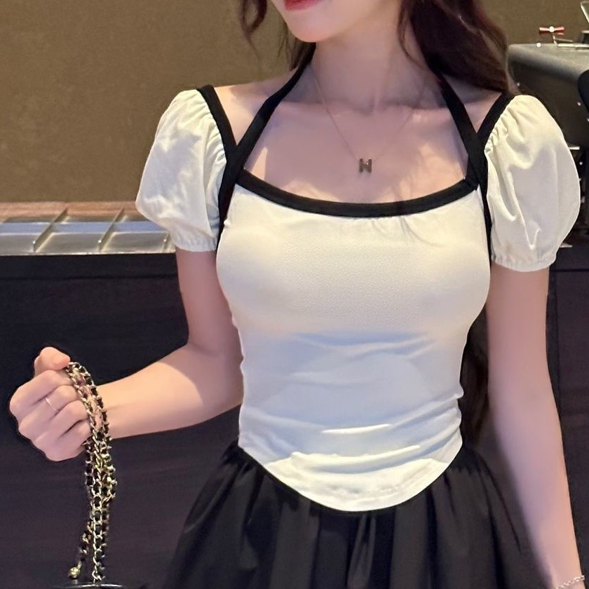 French square neck unique sweet and spicy low neck collarbone hanging neck summer top sweet temperament patchwork bubble short sleeved T-shirt