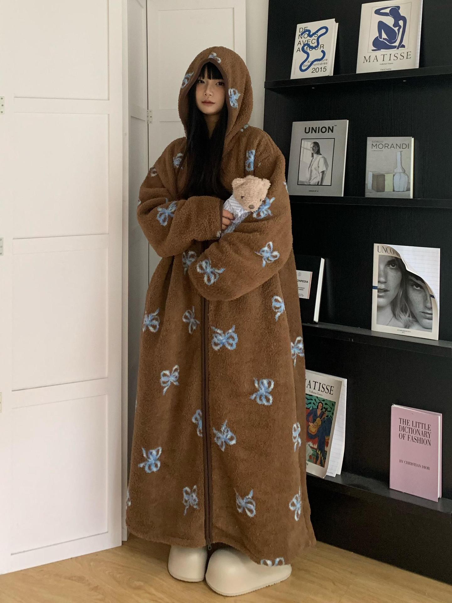 GraceChic GraceChic - Camisón de forro polar coral con estampado de mariposas y flores marrones para otoño e invierno, para mujer, con capucha y felpa, talla grande, para estar en casa