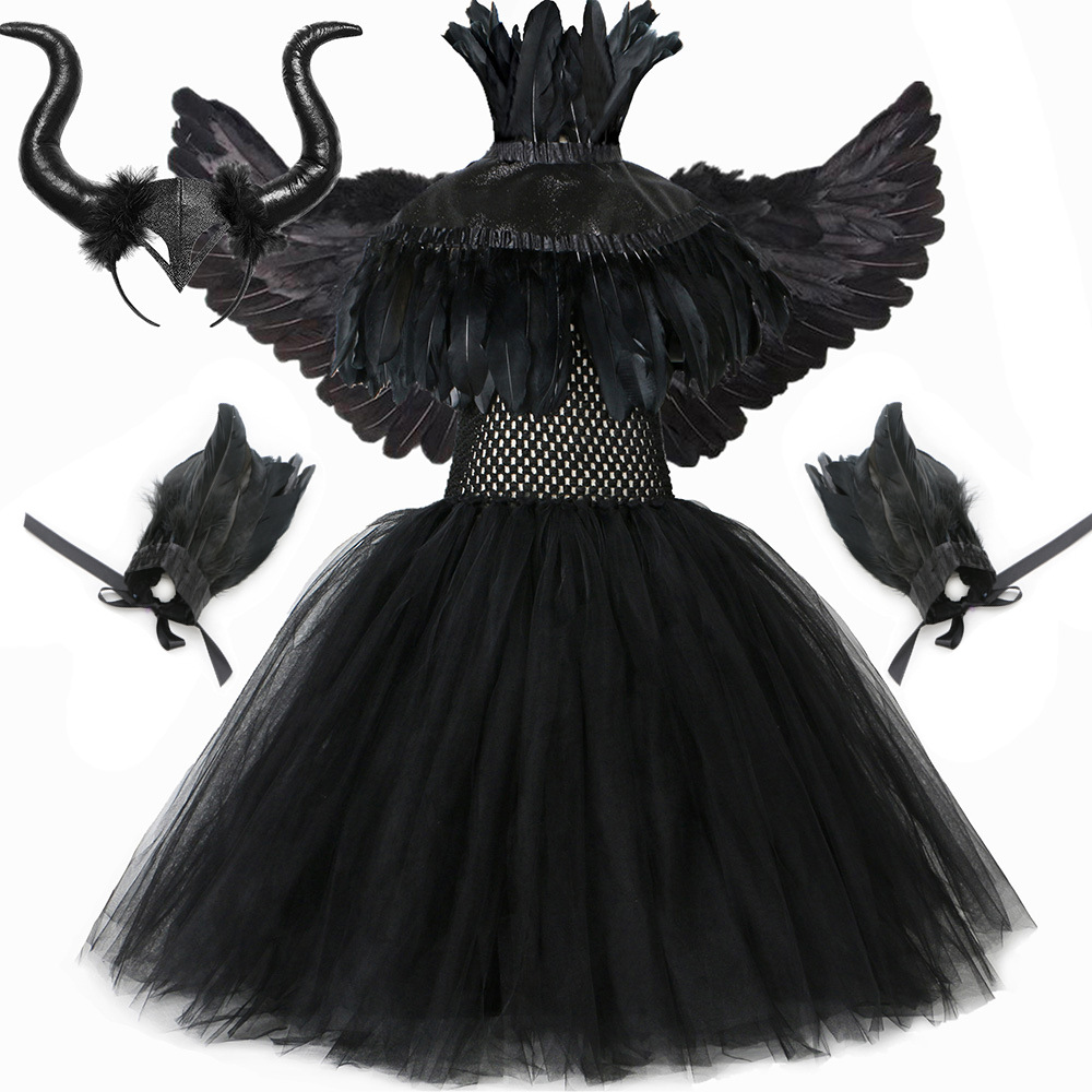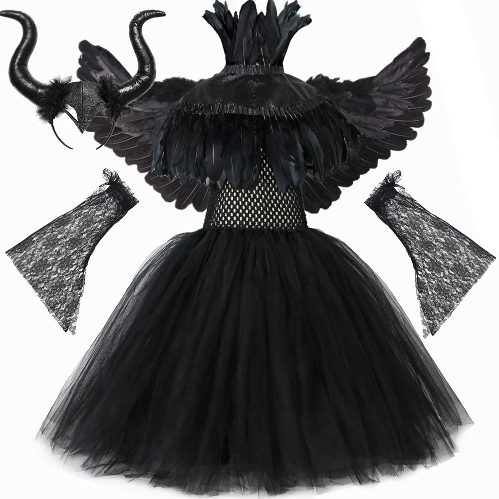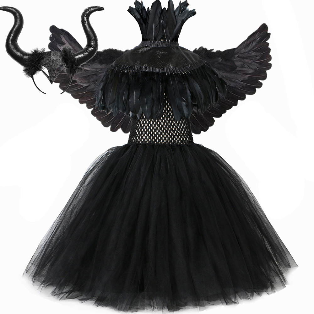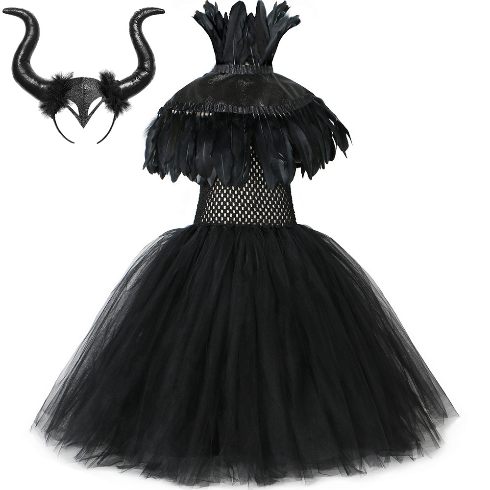 Ropa para niños Vestido de bruja maléfica Capa de plumas Disfraz de Halloween para niños Vestido de malla negro para niña gótica