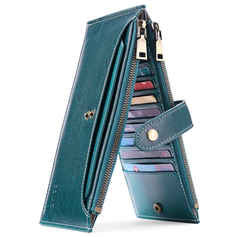 Cartera multifuncional de piel de vaca con cera de aceite para mujer, bolso de gran capacidad para tarjetas Vintage, con cremallera para teléfono móvil