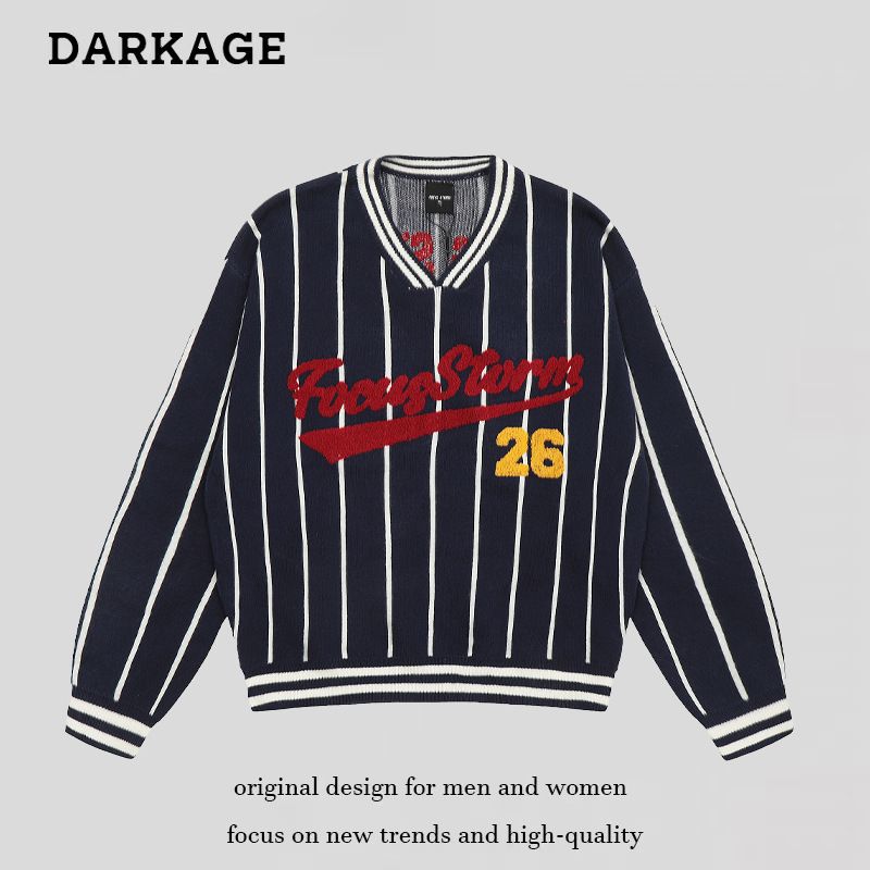 Marca de moda estadounidense con bordado flocado, rayas verticales de color en contraste, cuello en V, estilo deportivo holgado y relajado para hombre, tejido de punto.