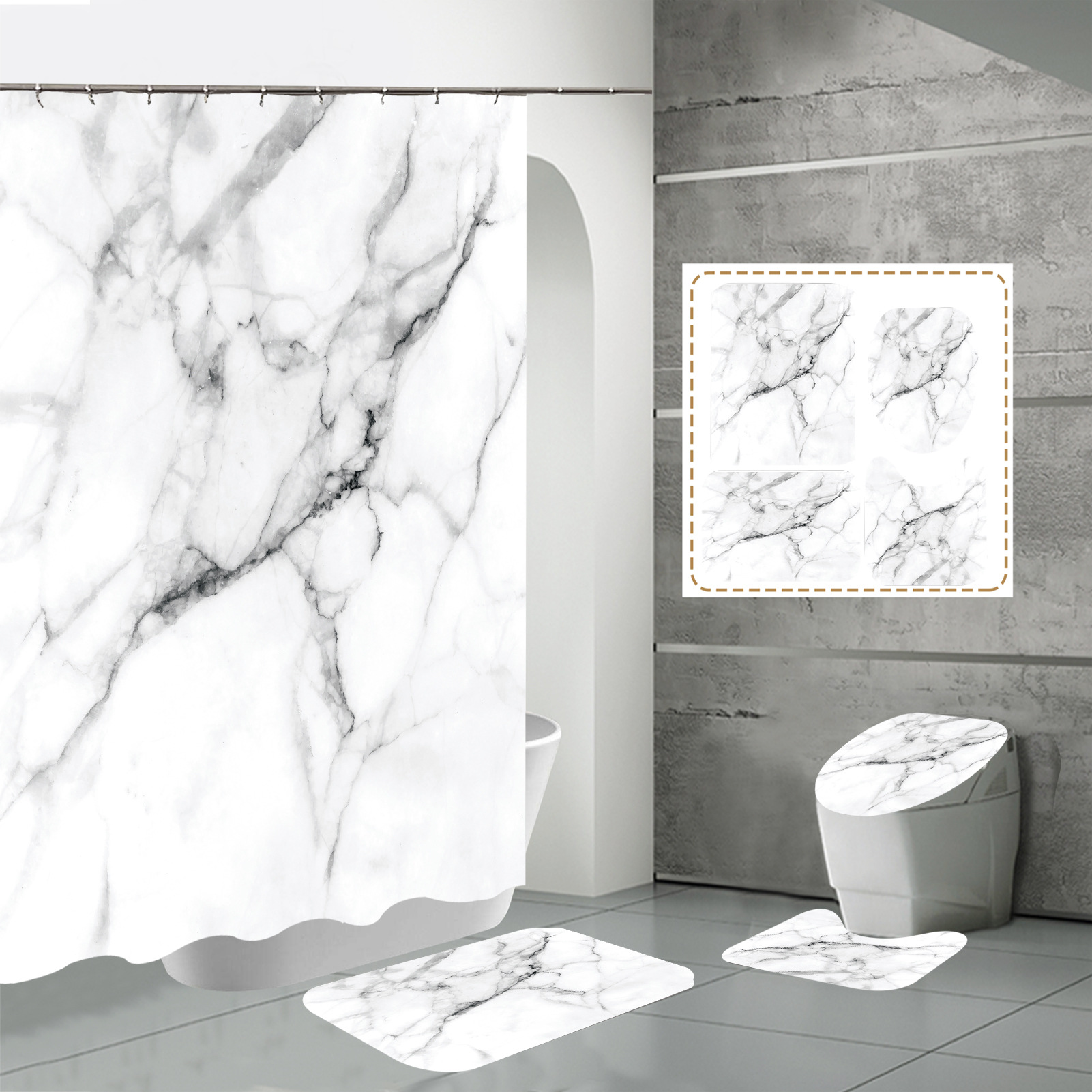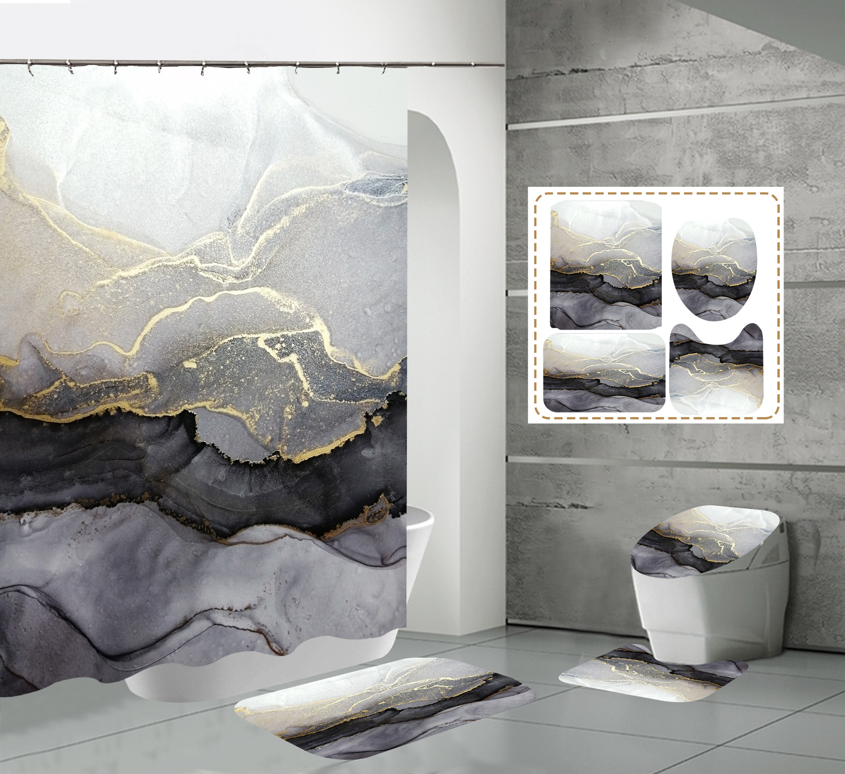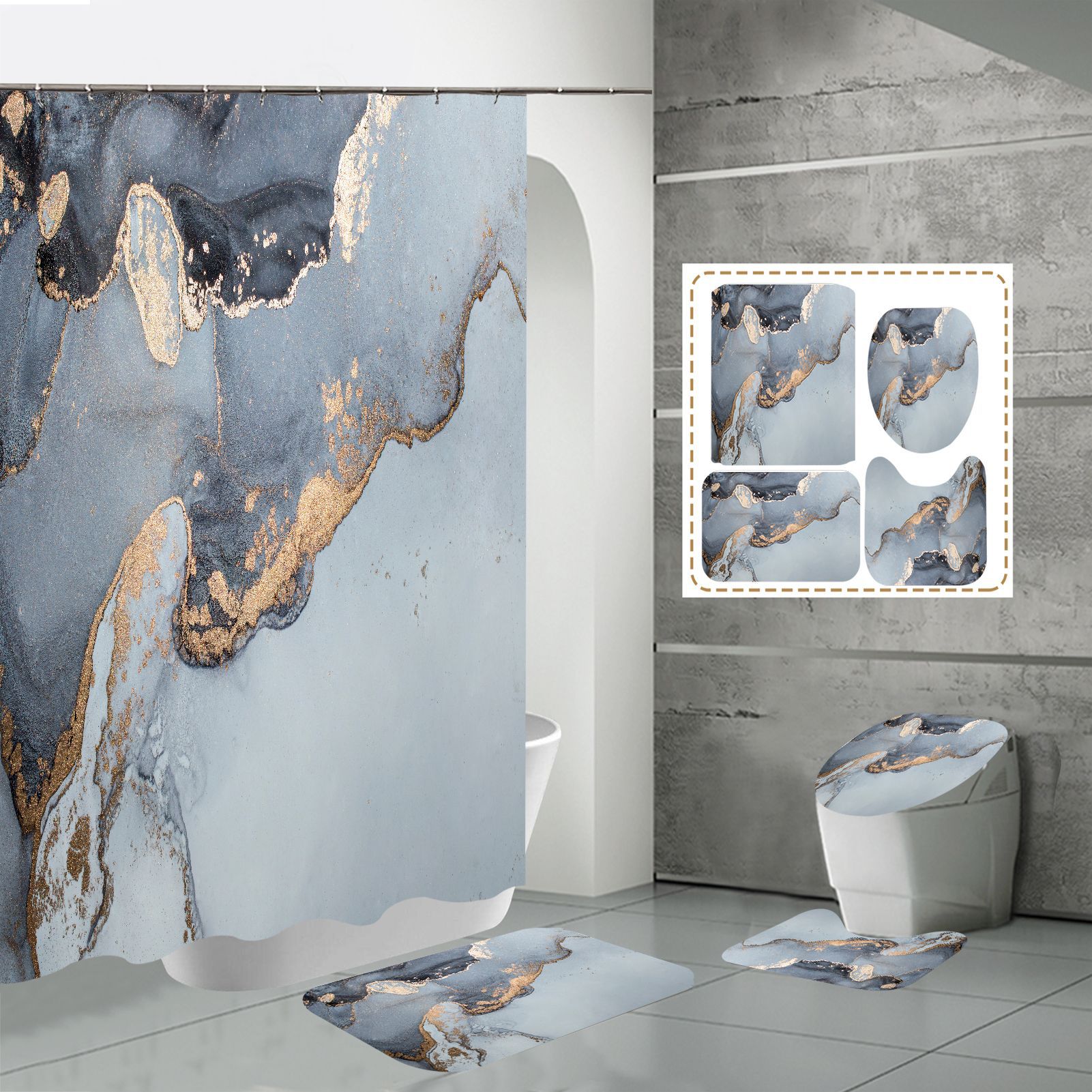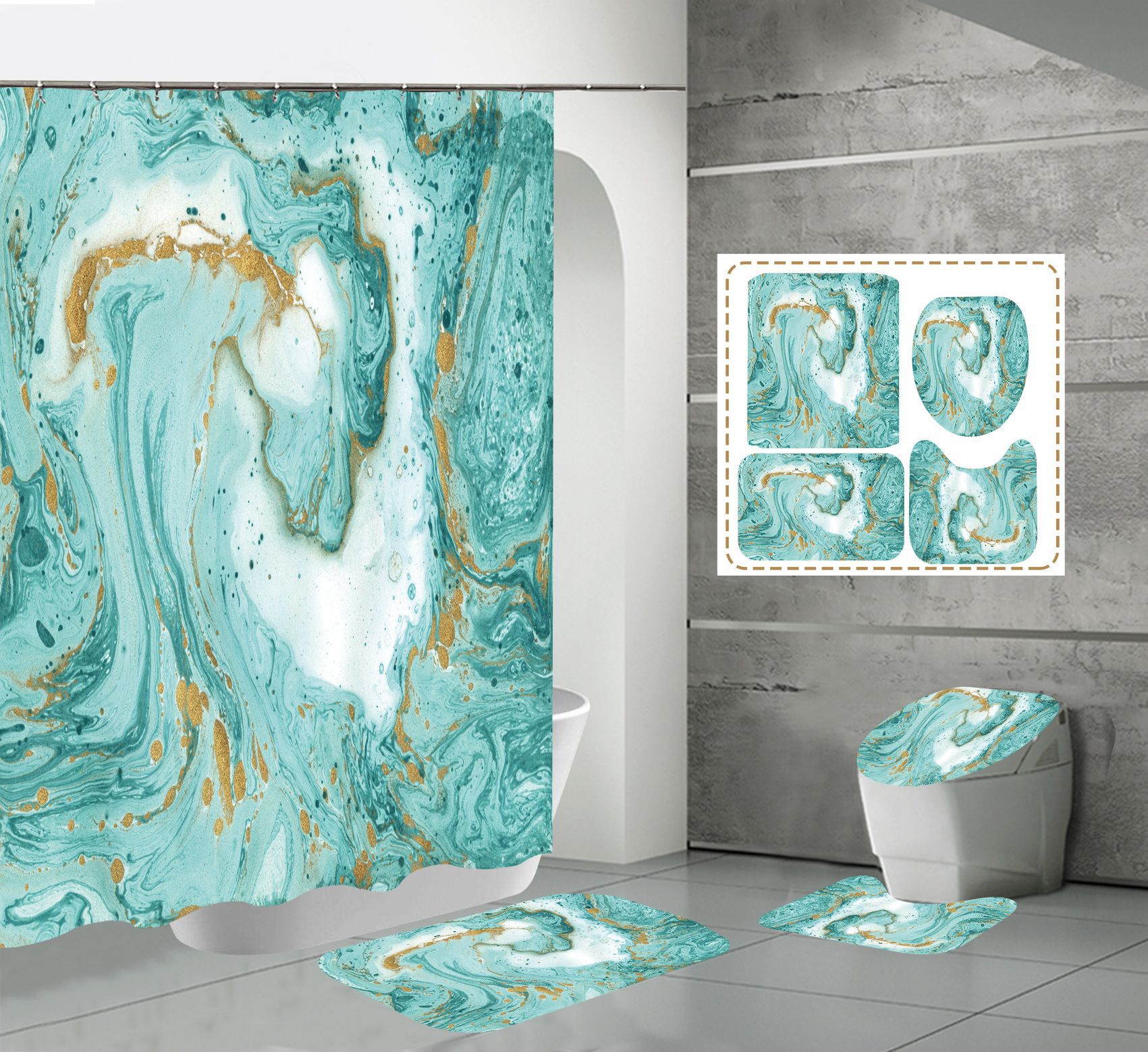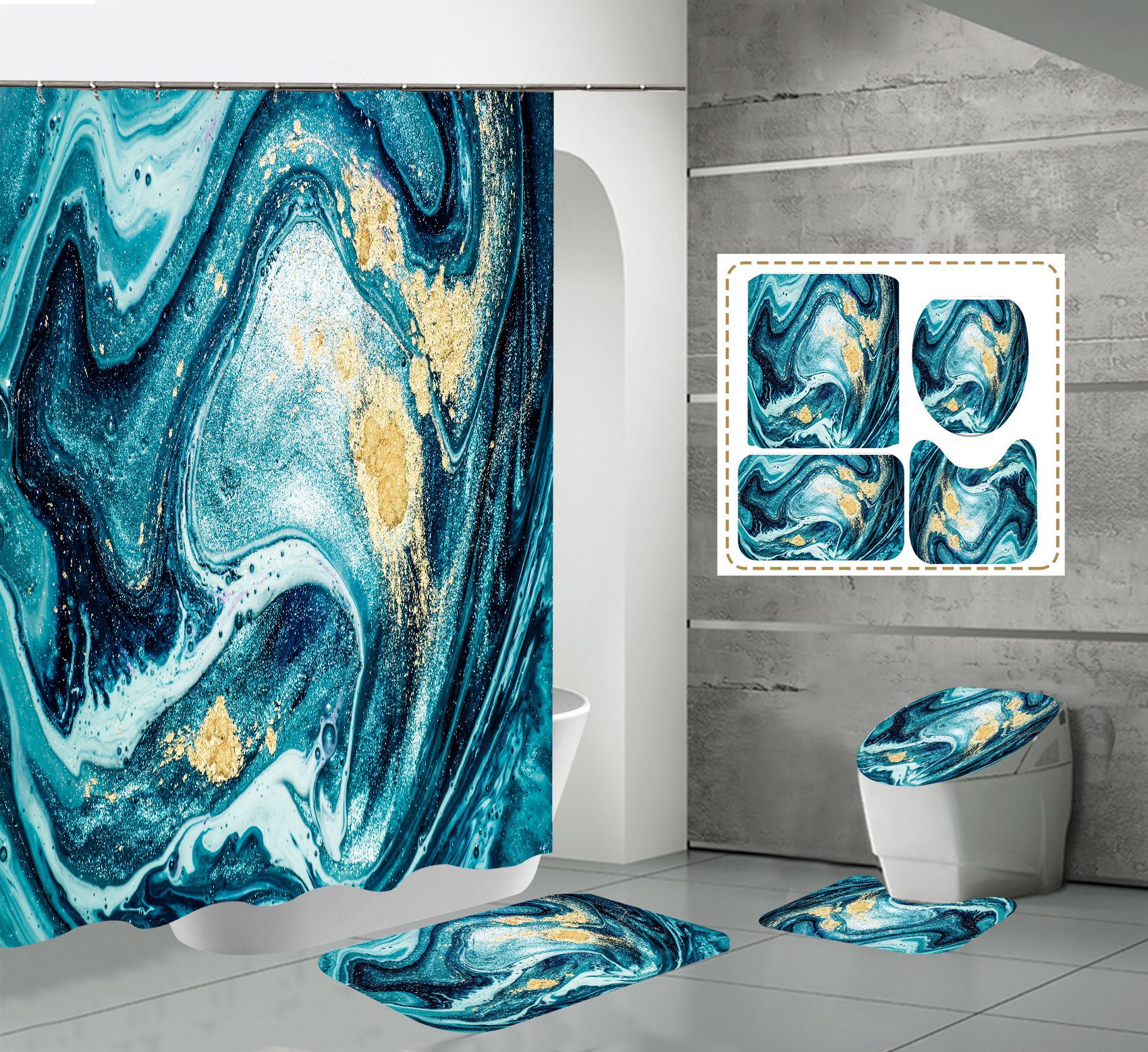 Juego de cuatro piezas, cortina de ducha, alfombrilla de suelo, alfombrilla en forma de U, cubierta de inodoro, 700g