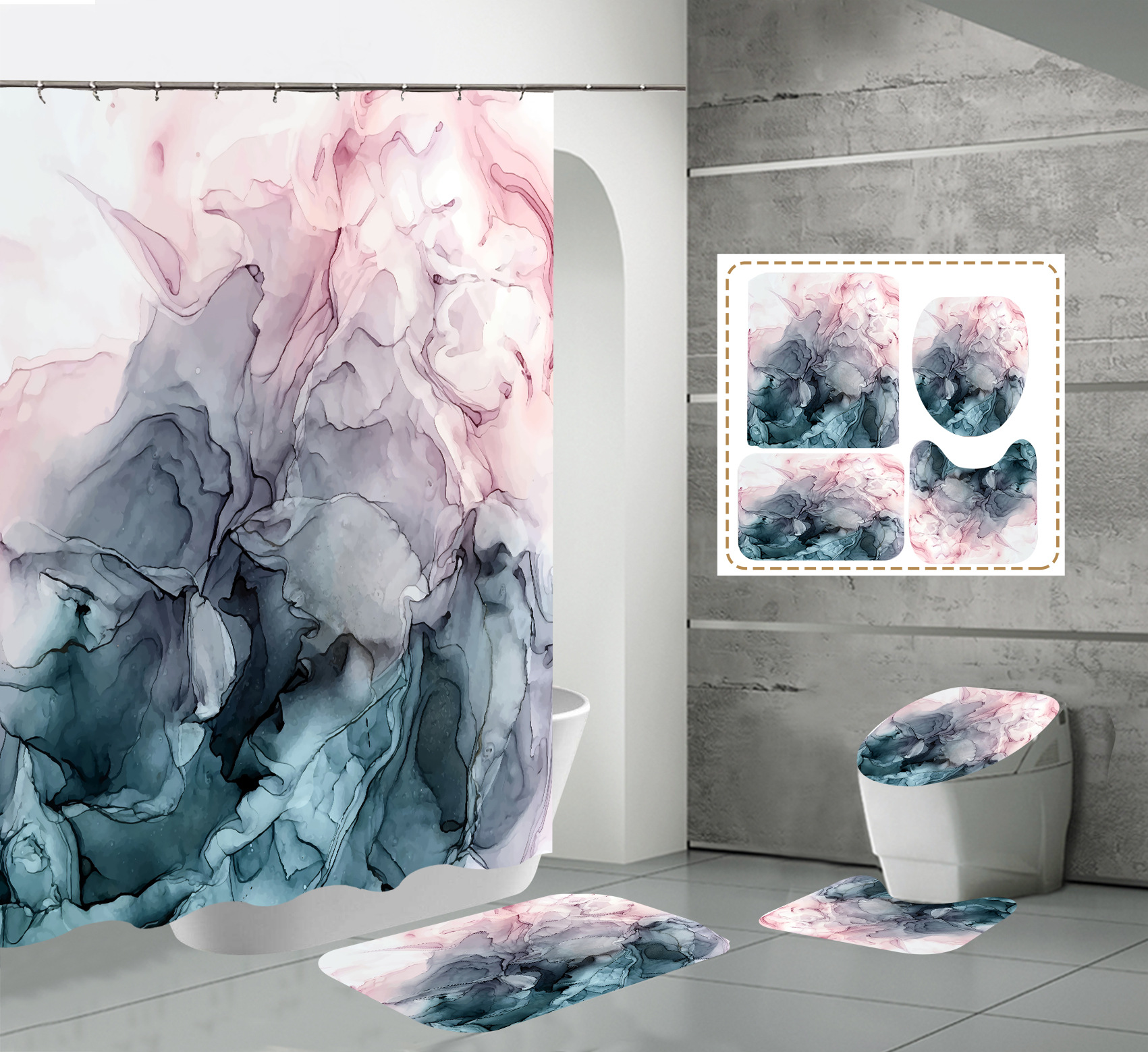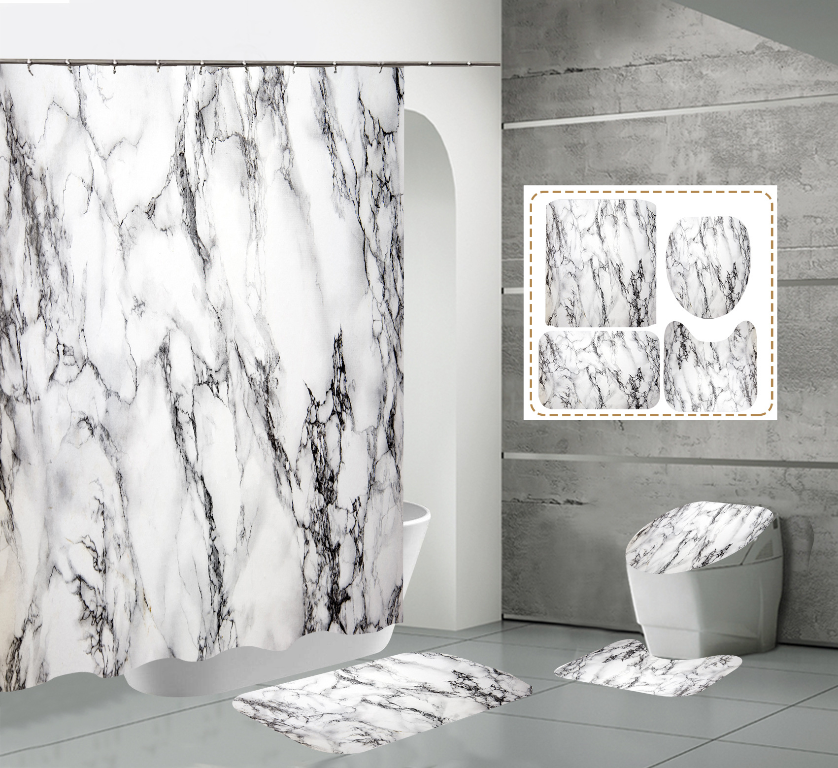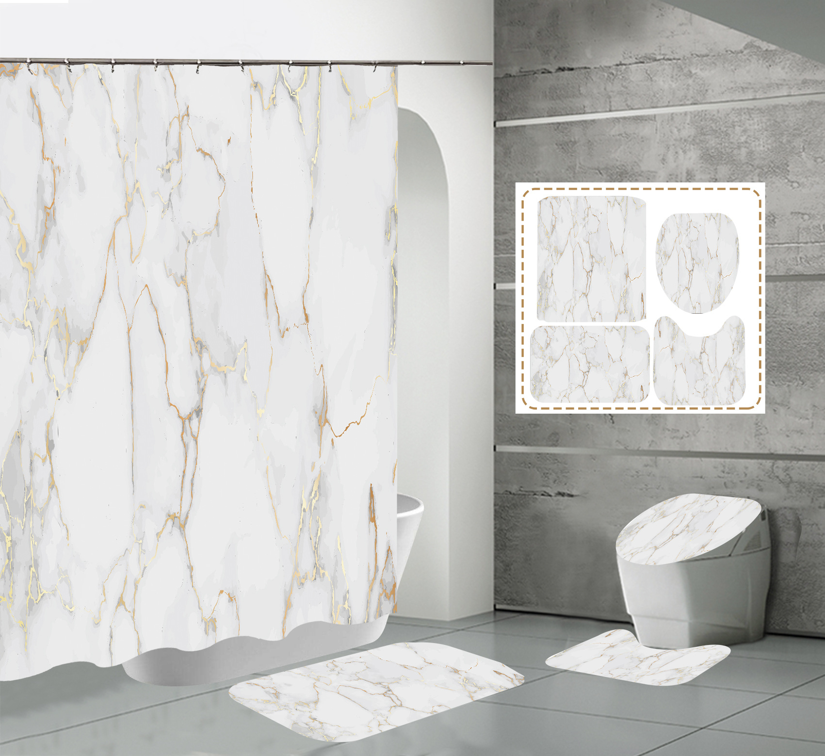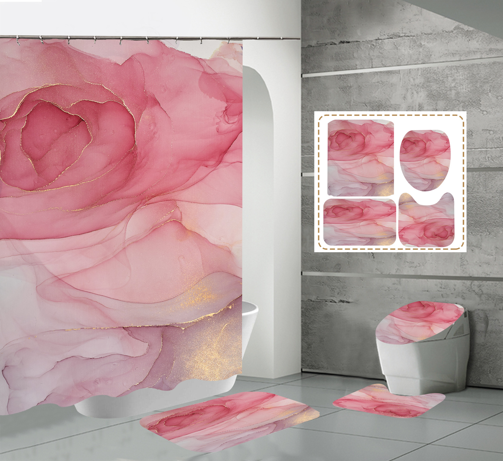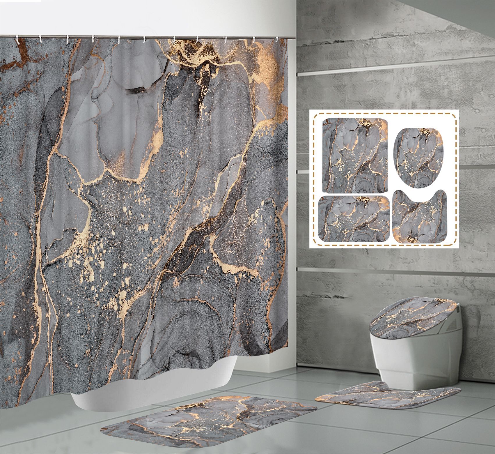 Juego de cuatro piezas, cortina de ducha, alfombrilla de suelo, alfombrilla en forma de U, cubierta de inodoro, 700g