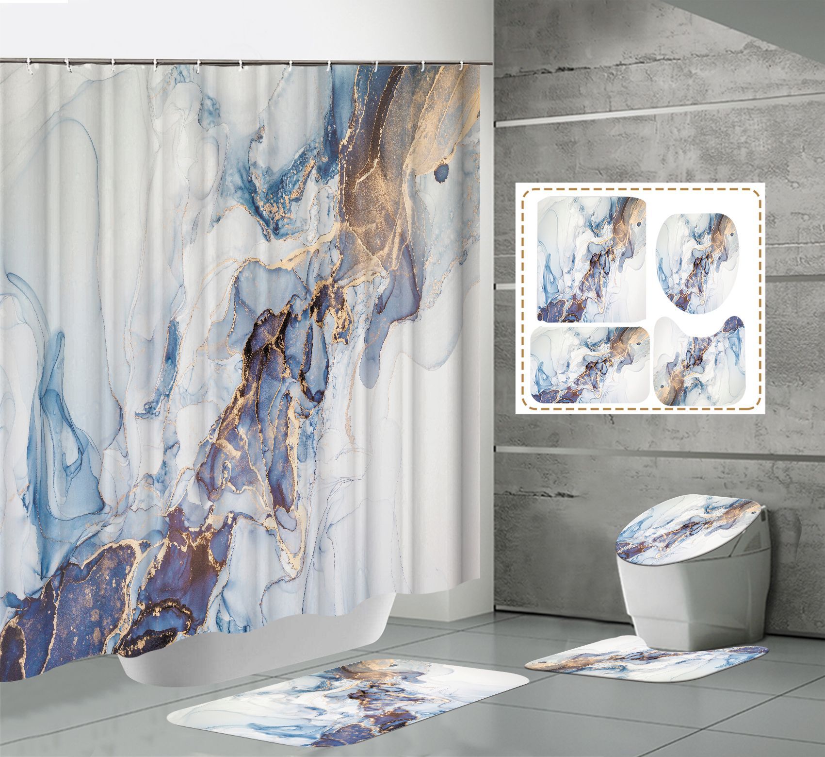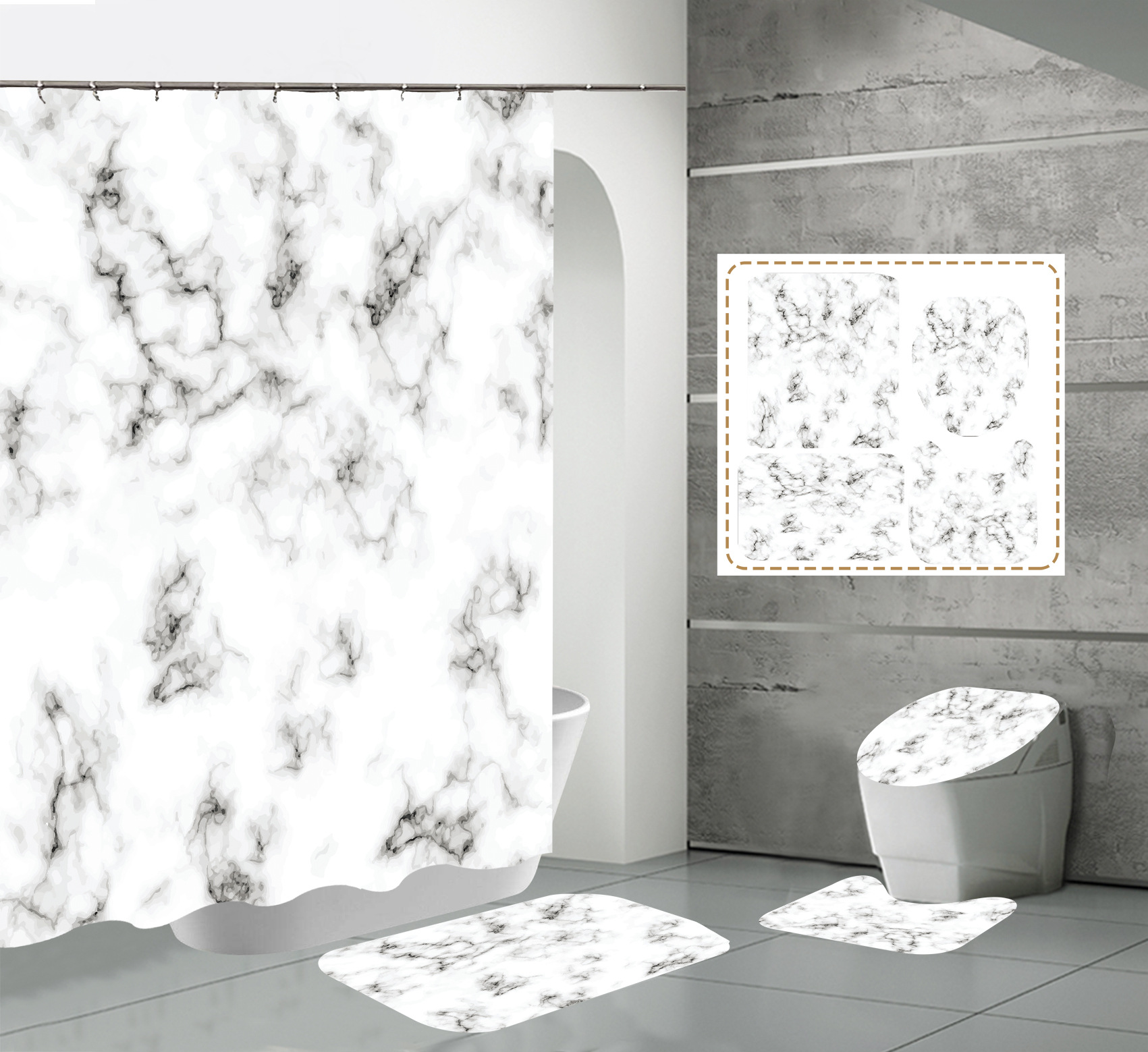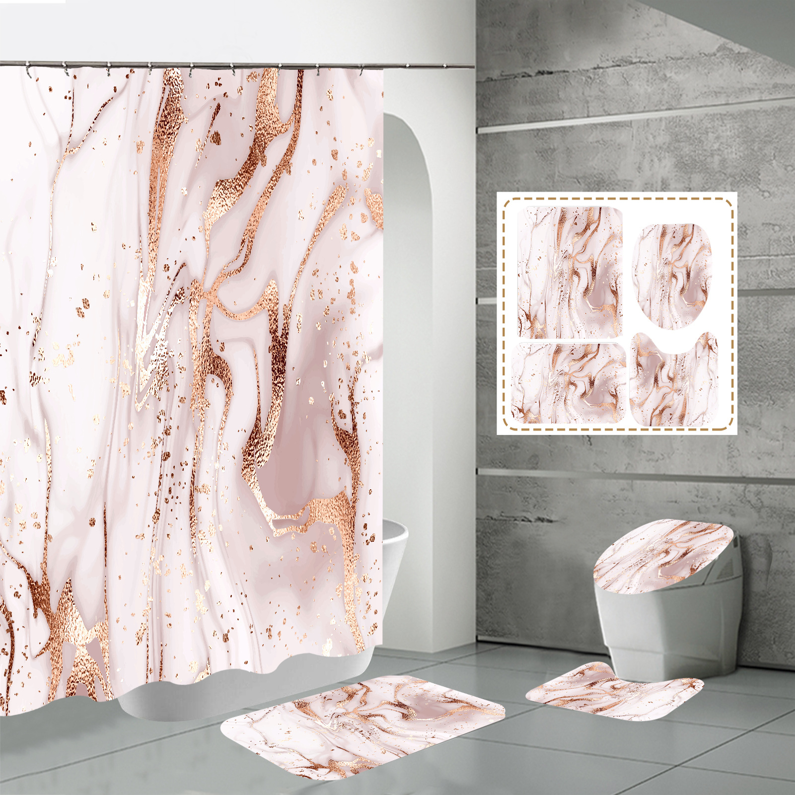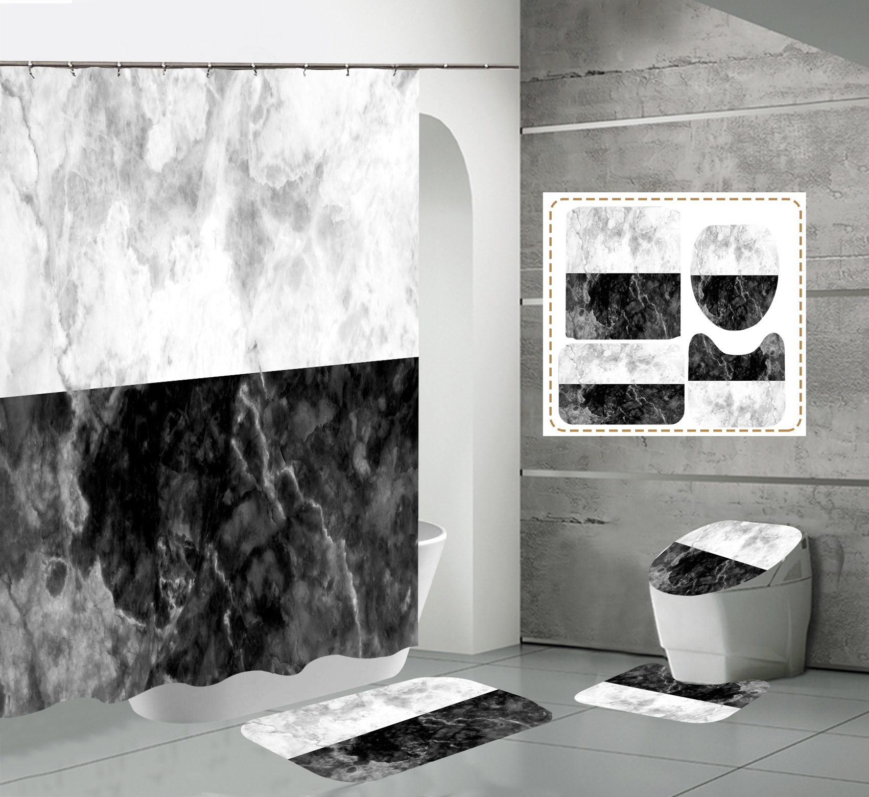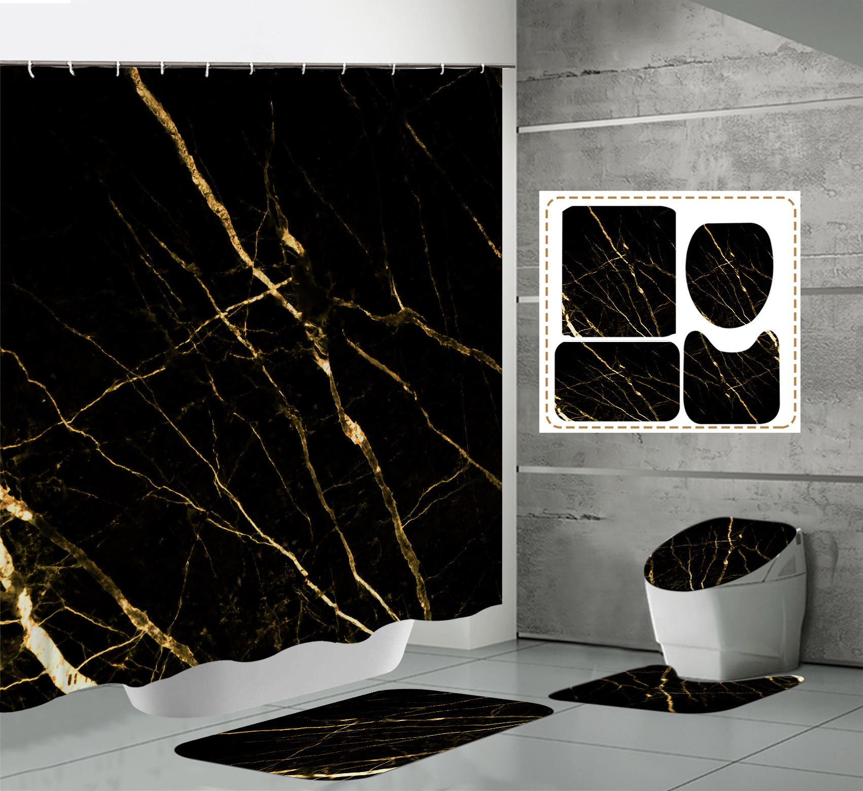 Juego de cuatro piezas, cortina de ducha, alfombrilla de suelo, alfombrilla en forma de U, cubierta de inodoro, 700g