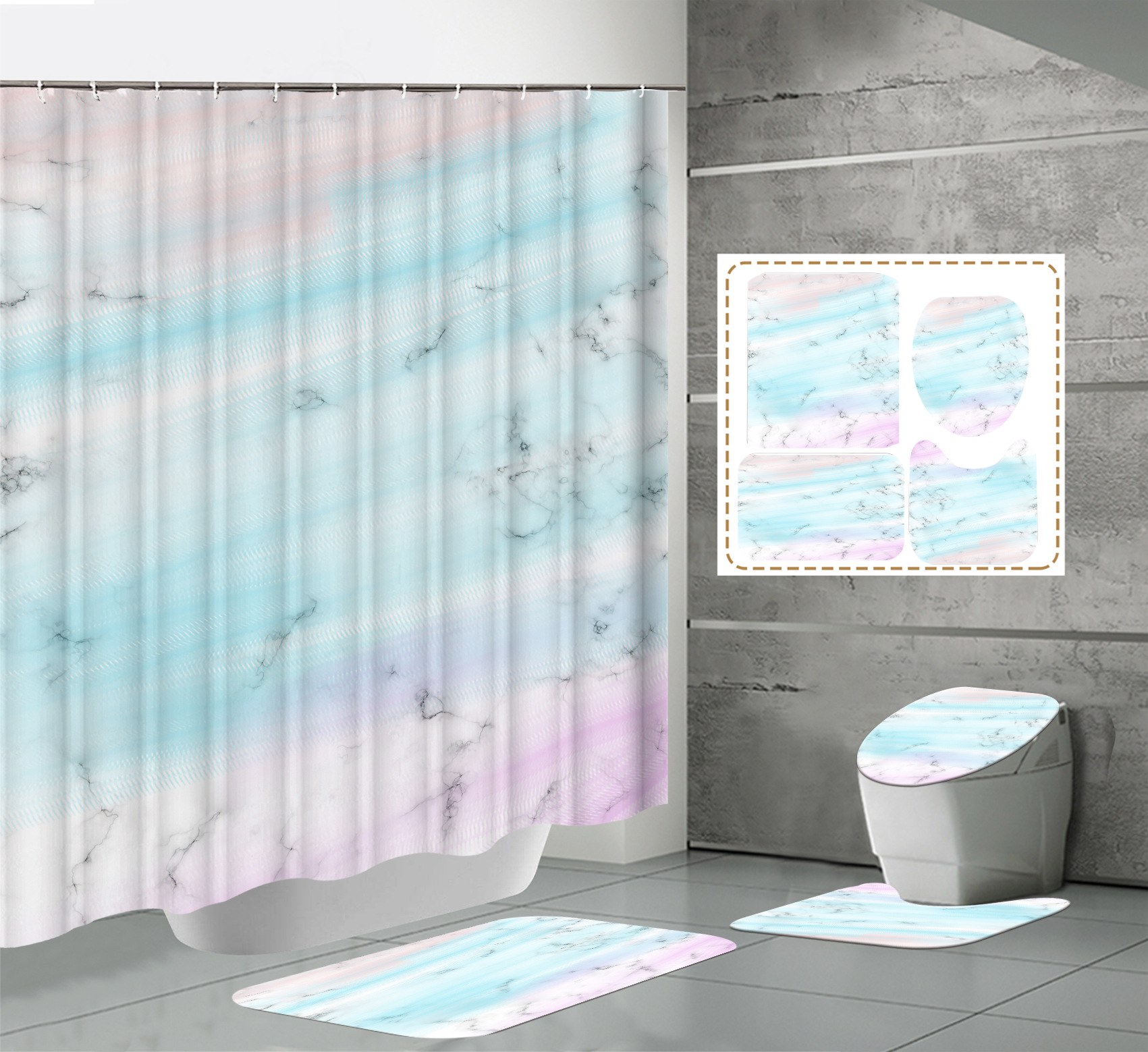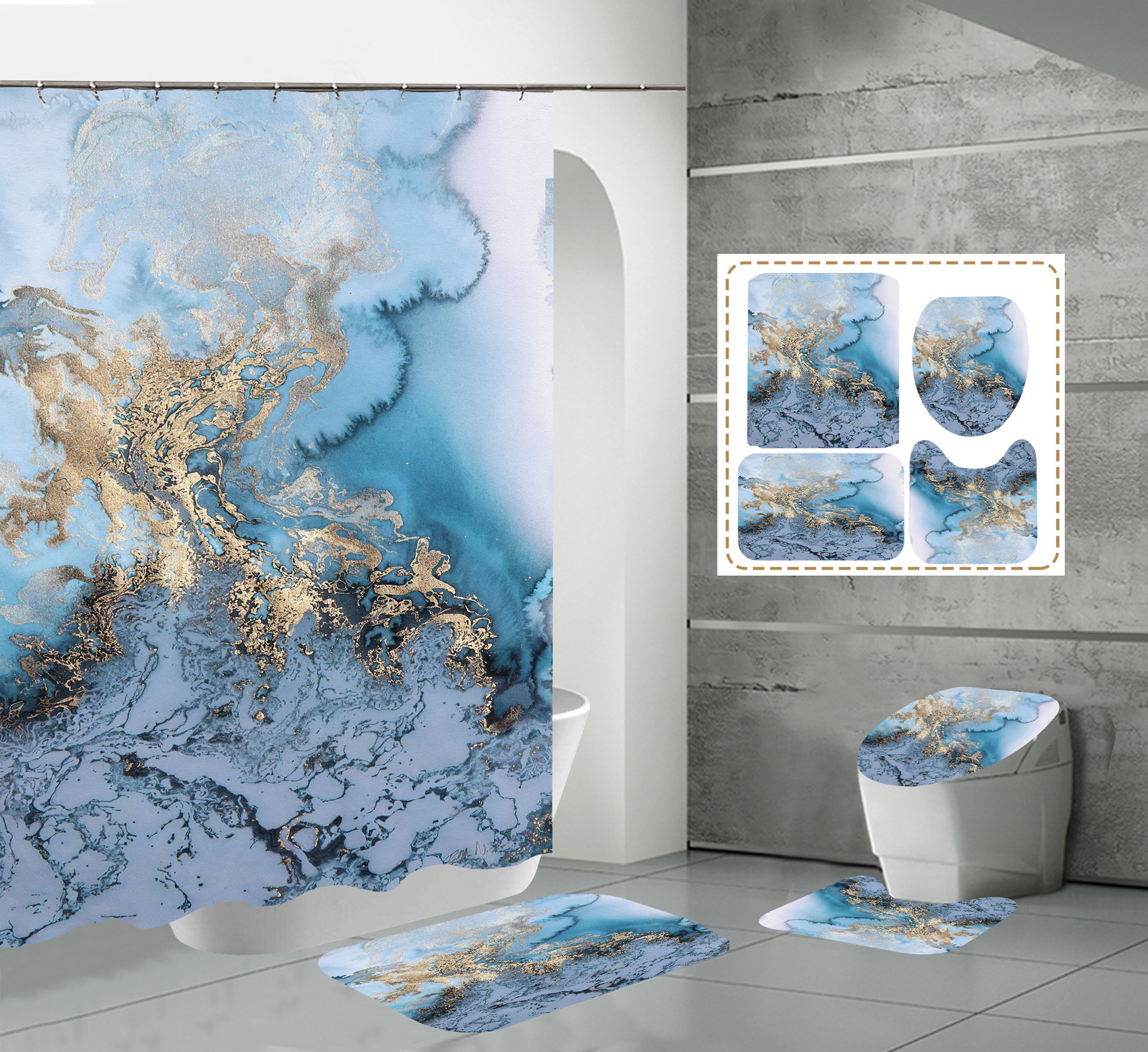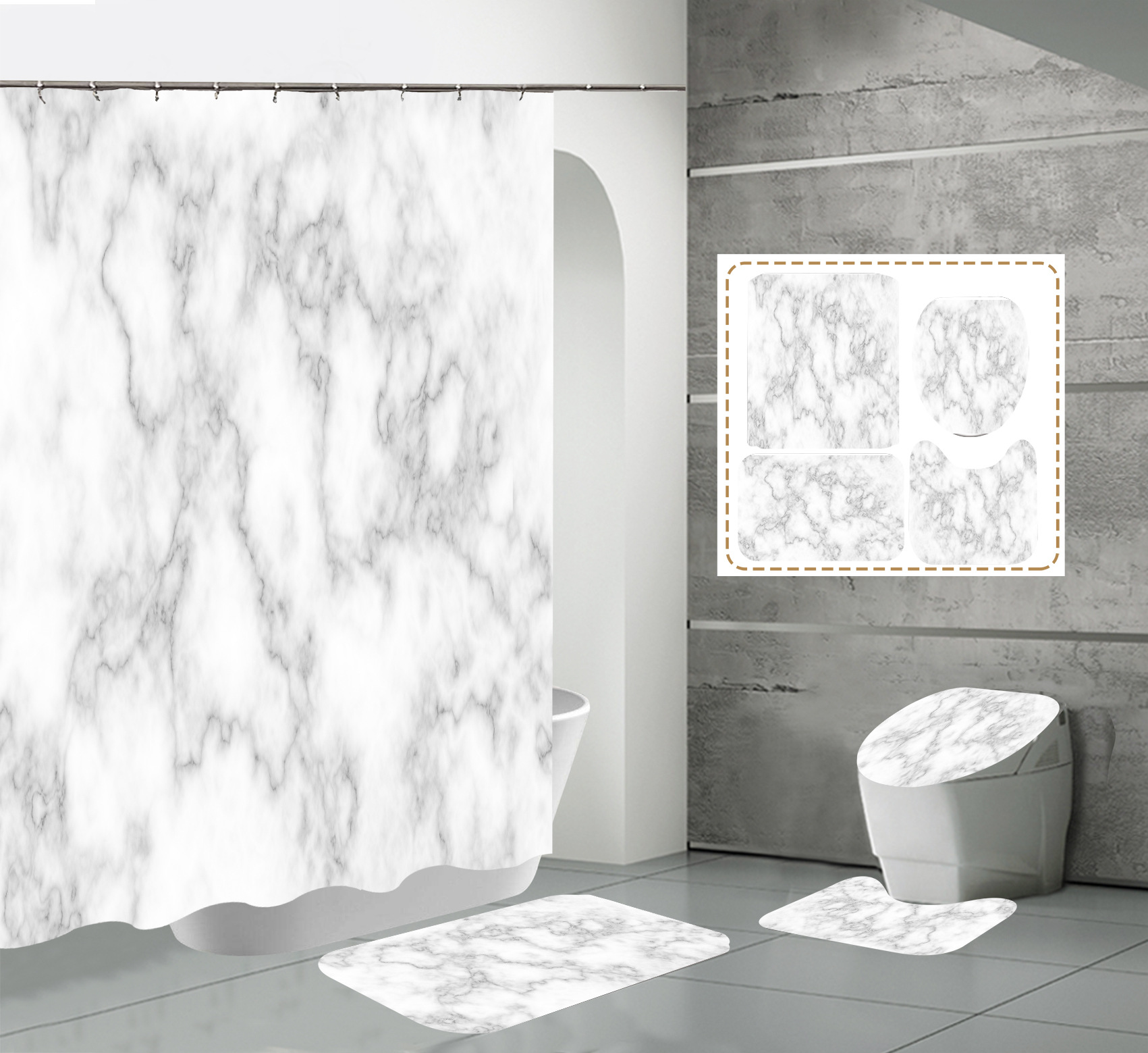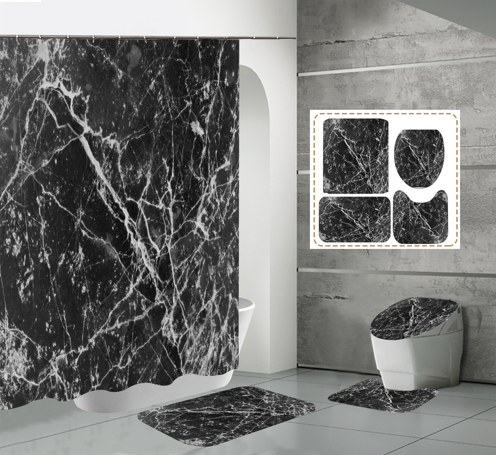 Juego de cuatro piezas, cortina de ducha, alfombrilla de suelo, alfombrilla en forma de U, cubierta de inodoro, 700g