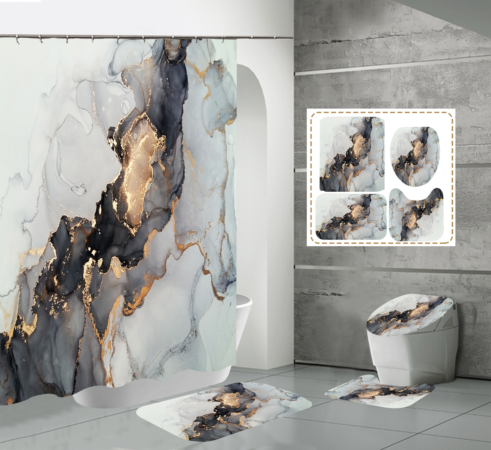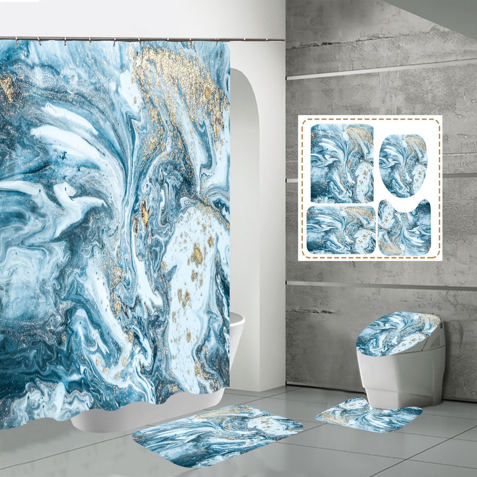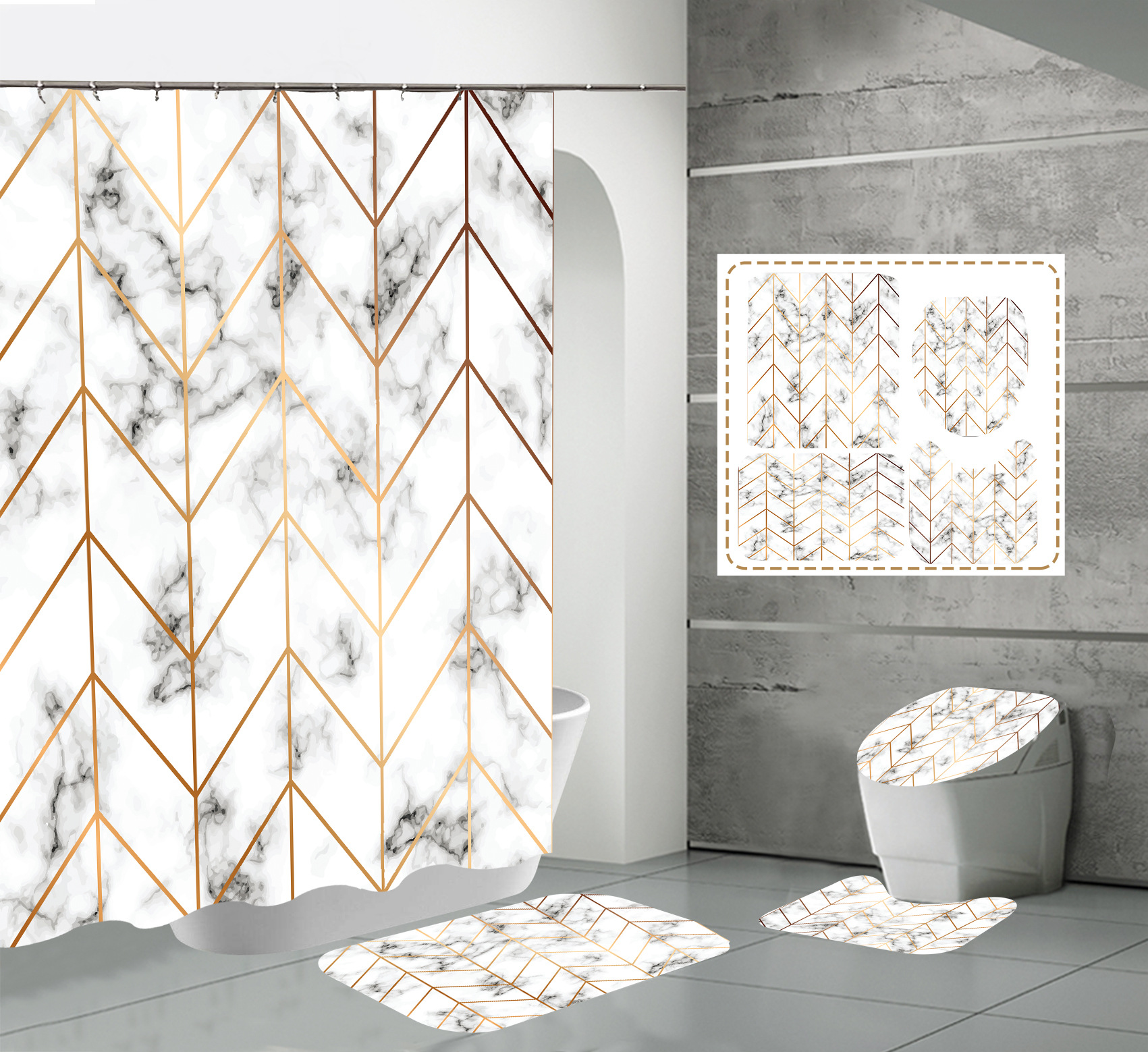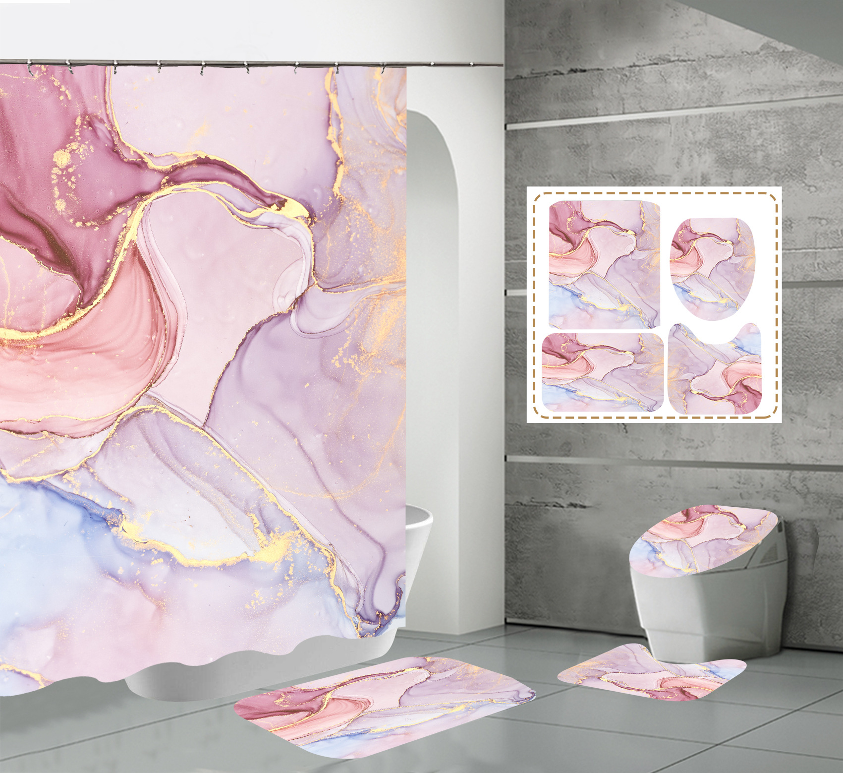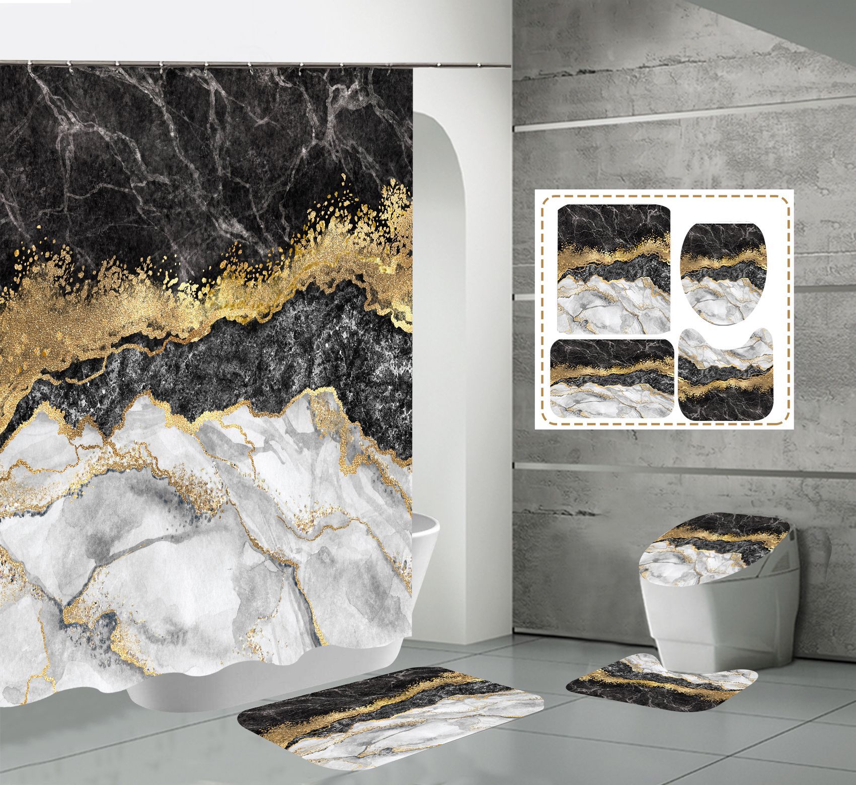 Juego de cuatro piezas, cortina de ducha, alfombrilla de suelo, alfombrilla en forma de U, cubierta de inodoro, 700g