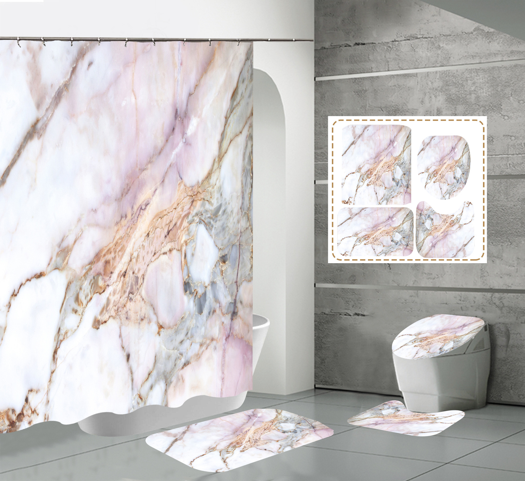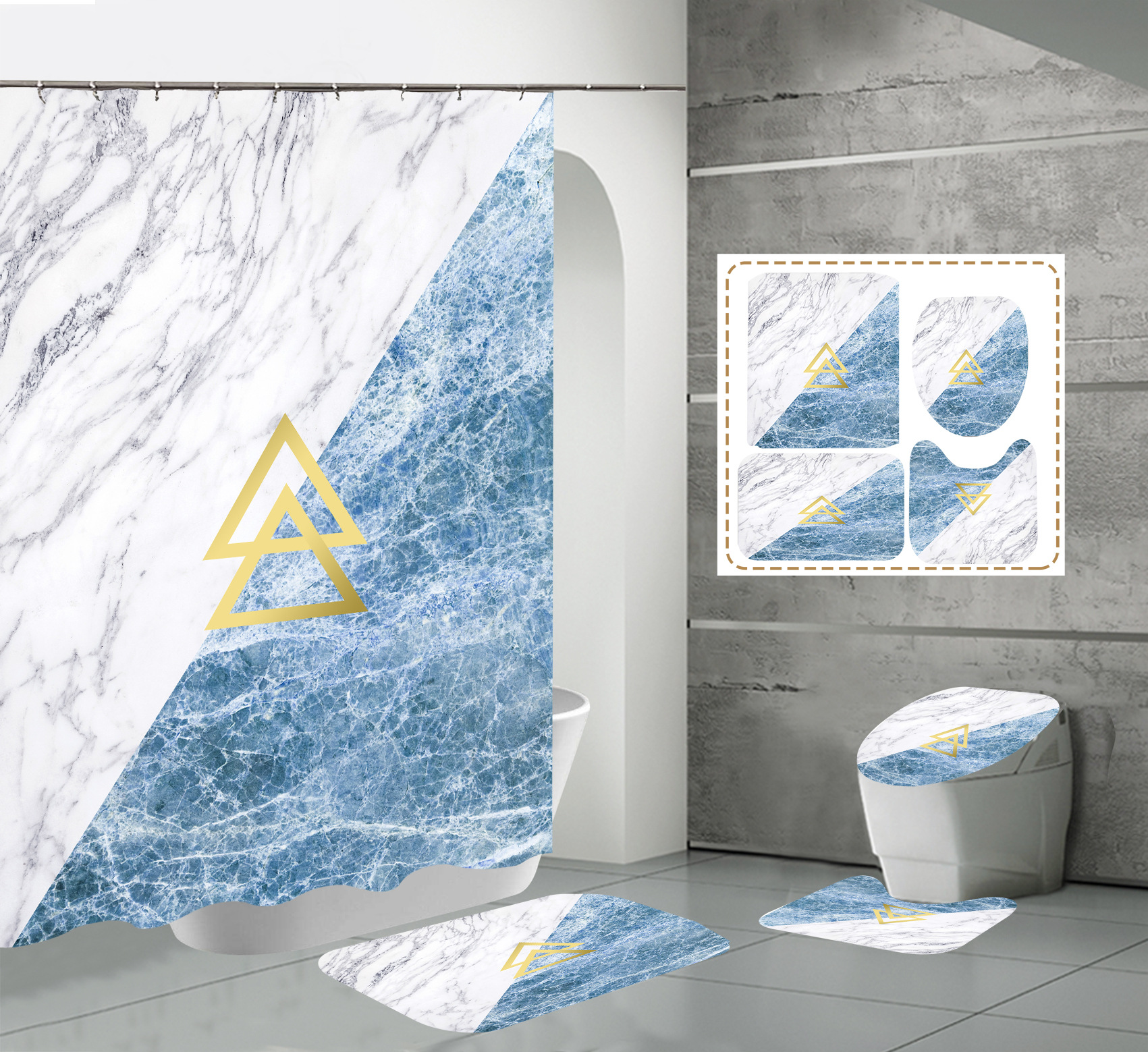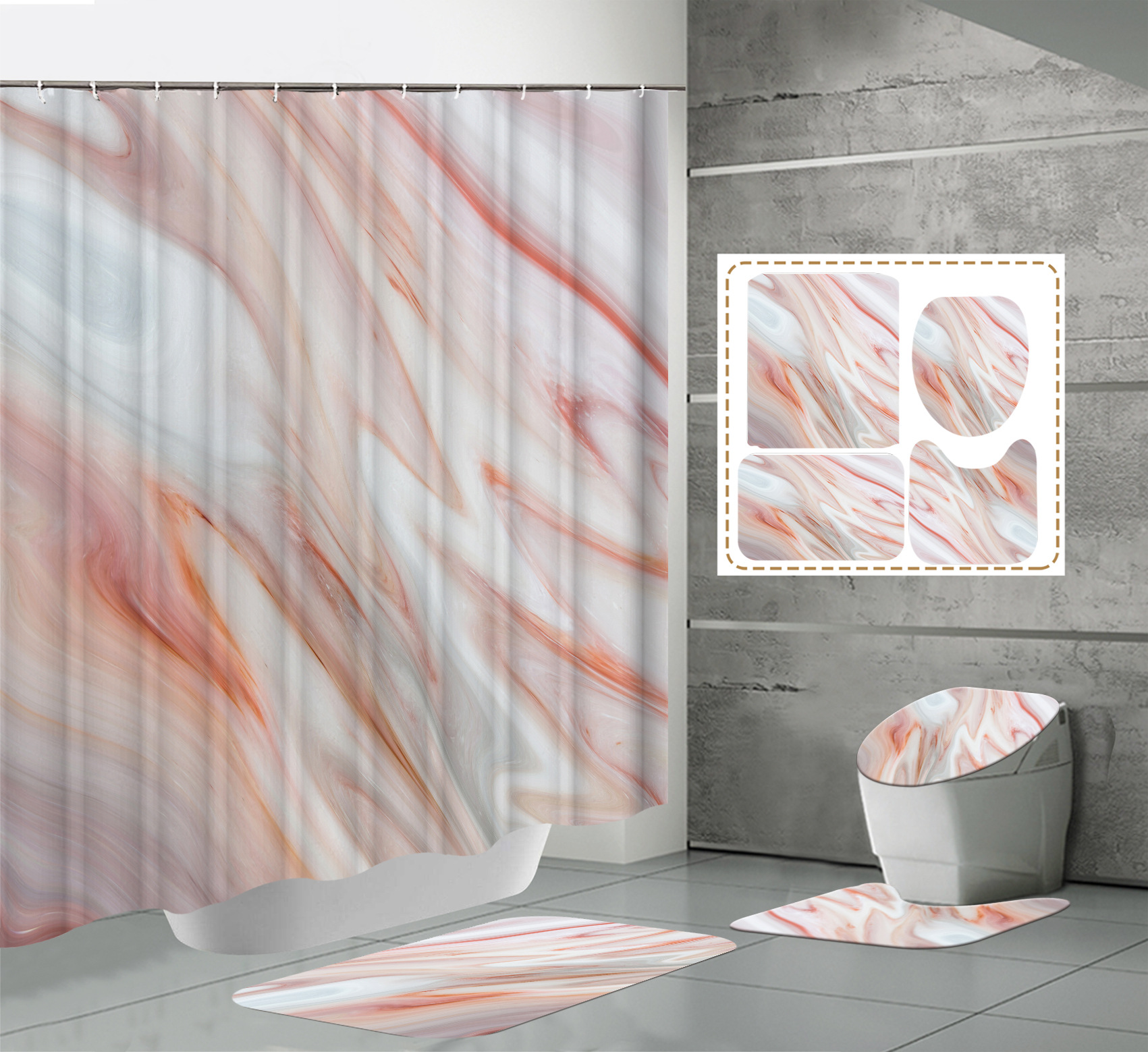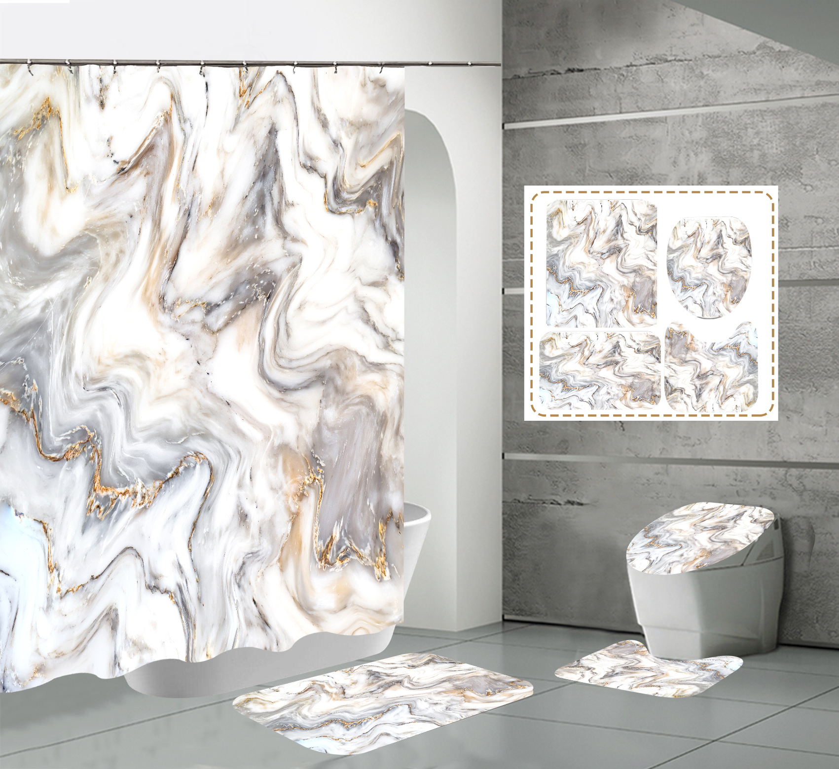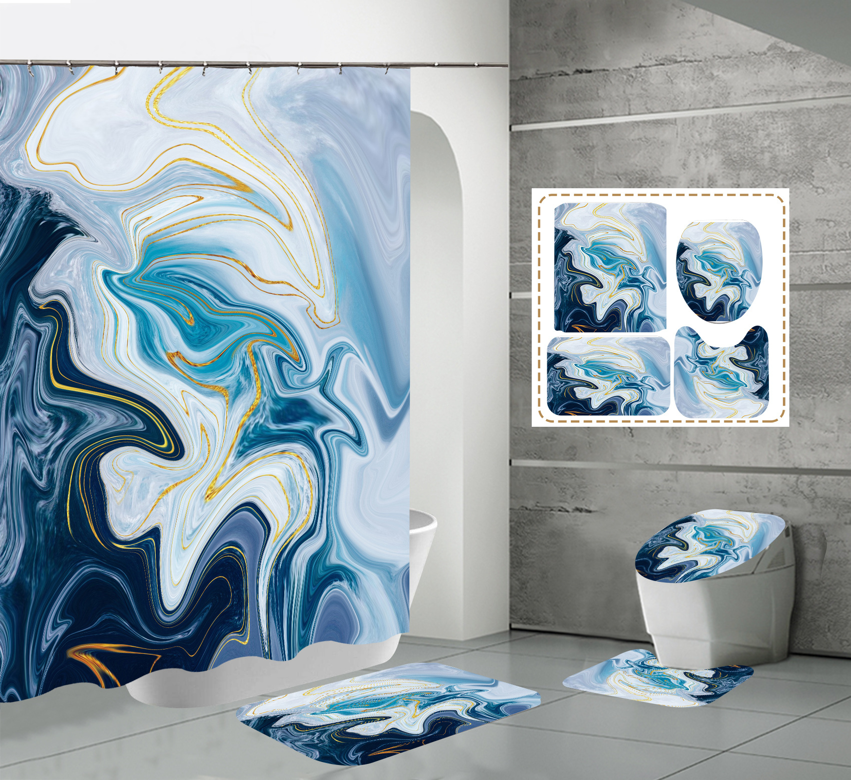 Juego de cuatro piezas, cortina de ducha, alfombrilla de suelo, alfombrilla en forma de U, cubierta de inodoro, 700g