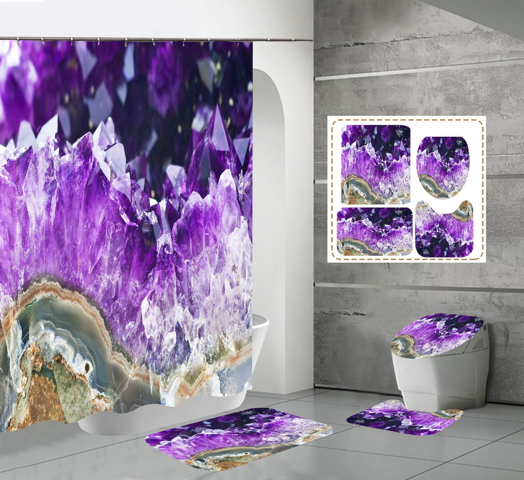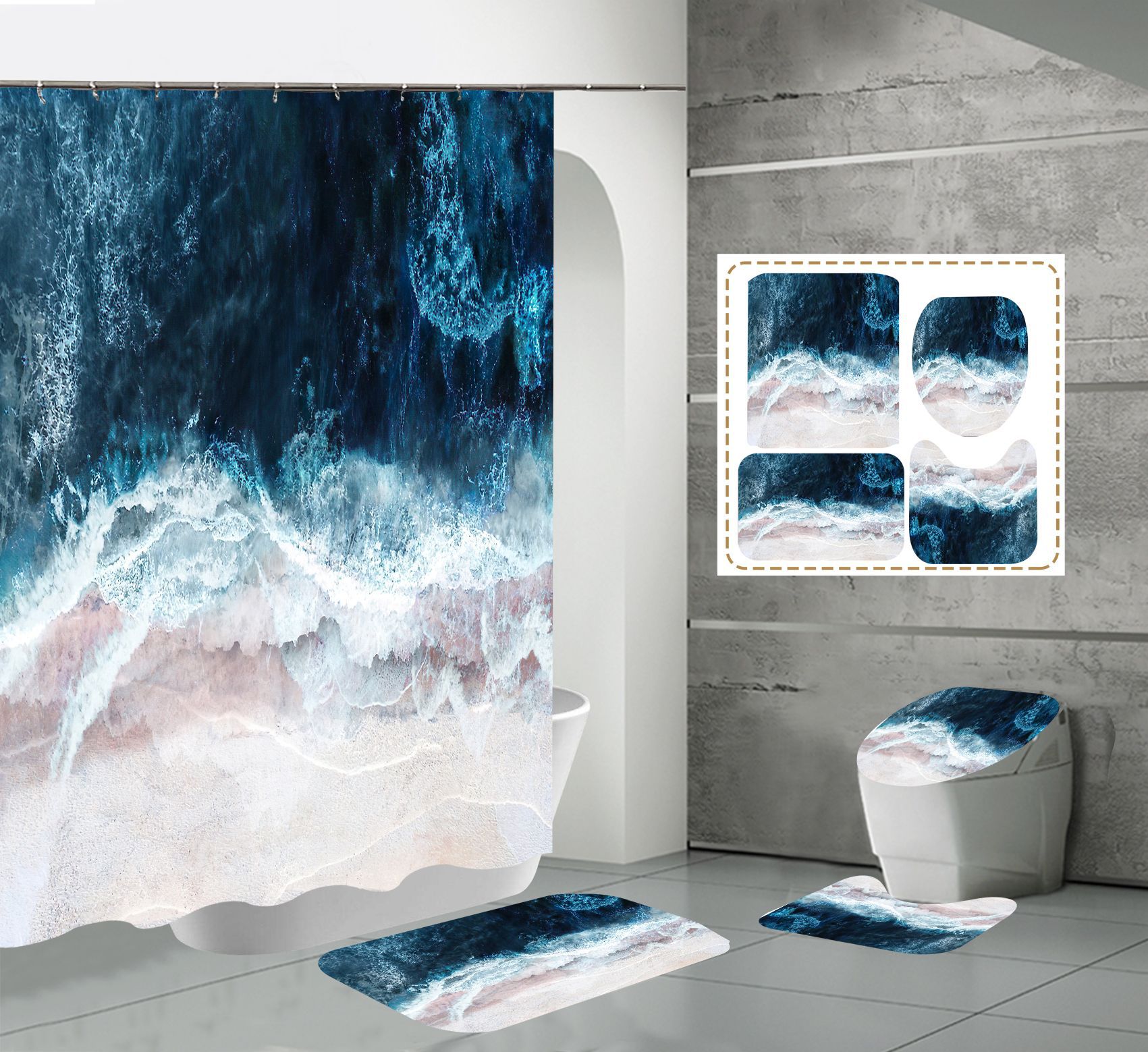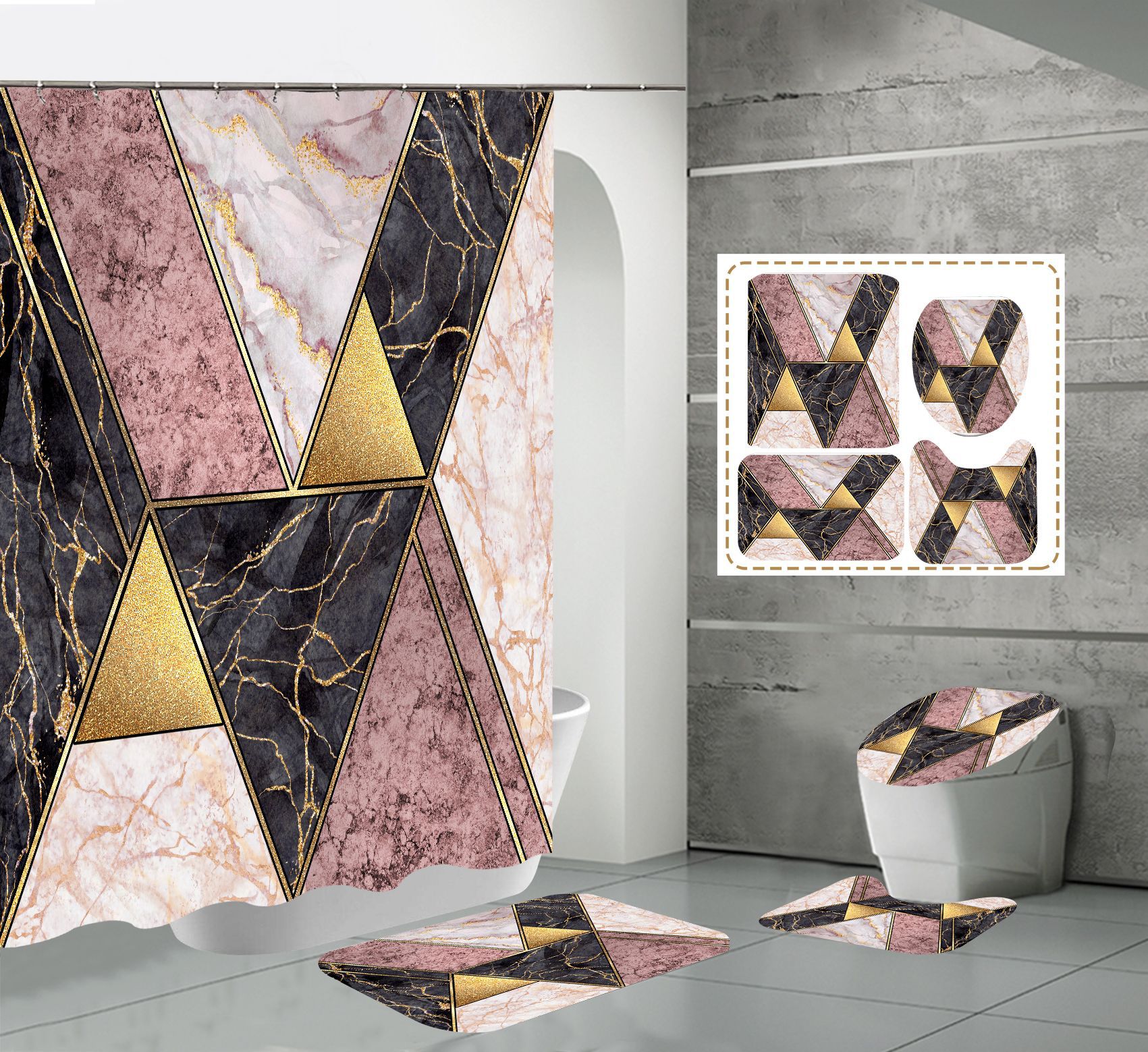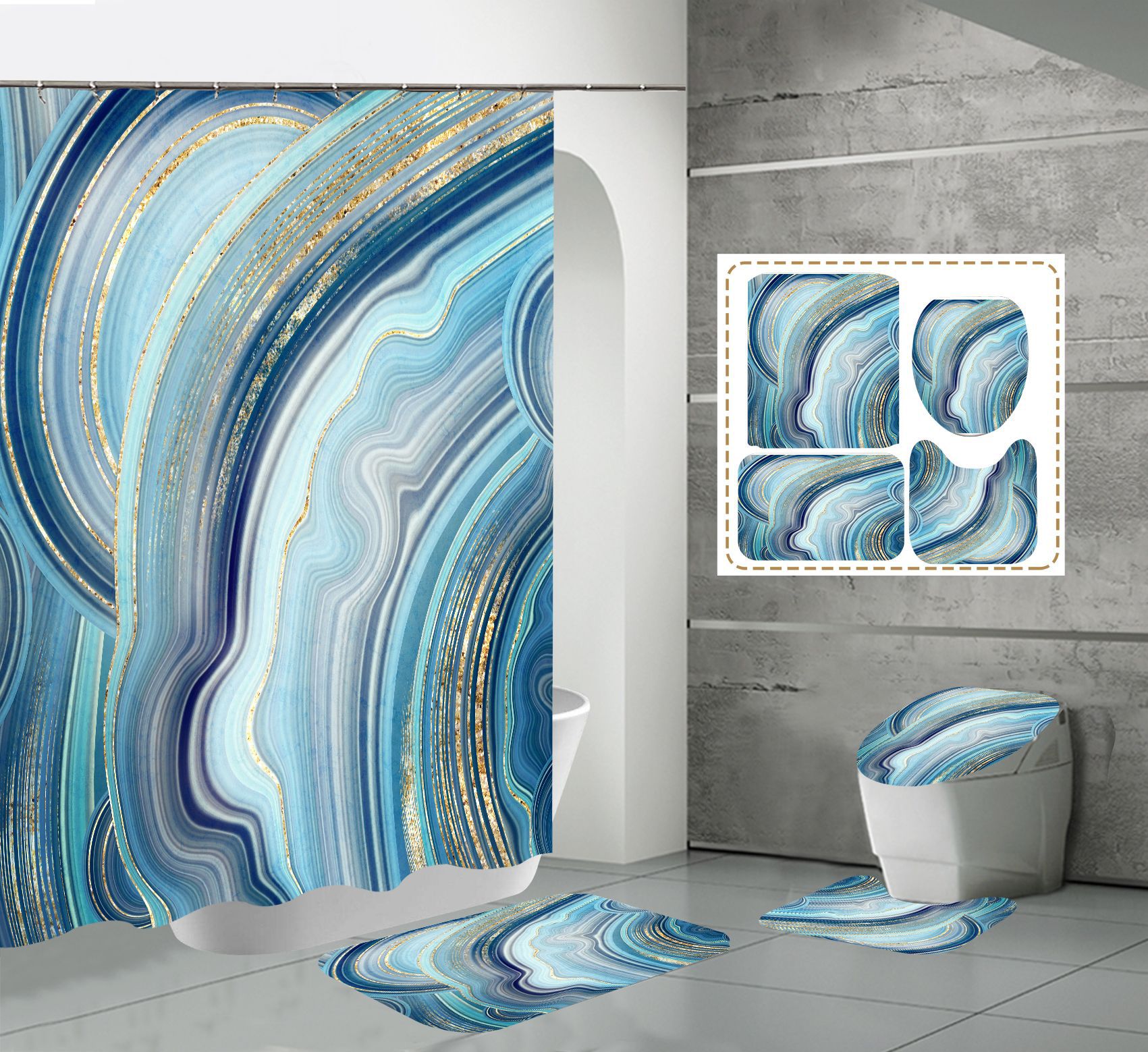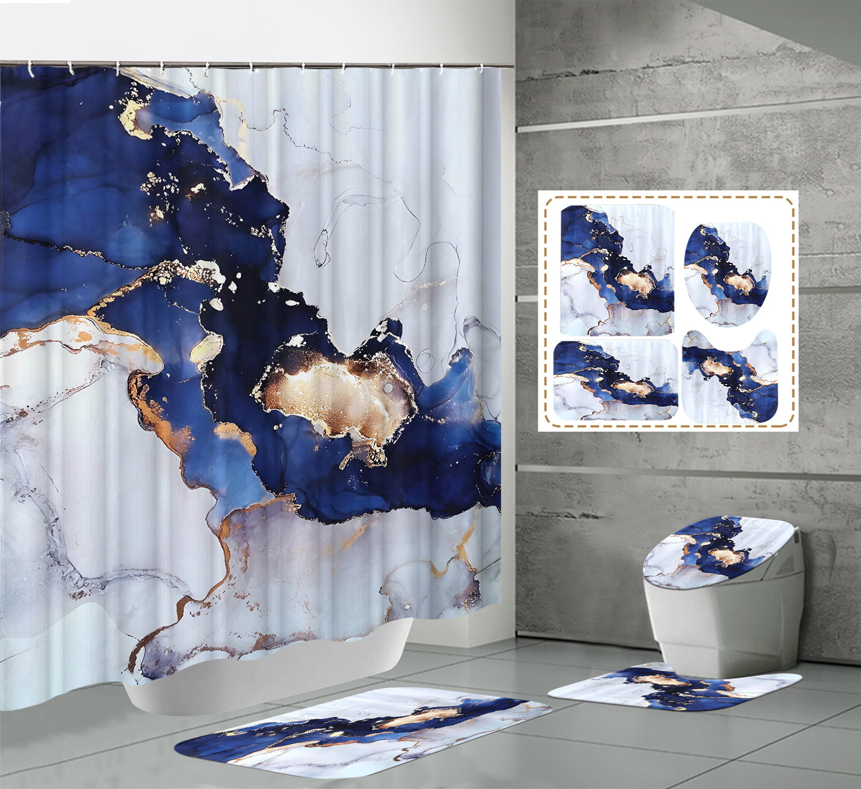 Juego de cuatro piezas, cortina de ducha, alfombrilla de suelo, alfombrilla en forma de U, cubierta de inodoro, 700g
