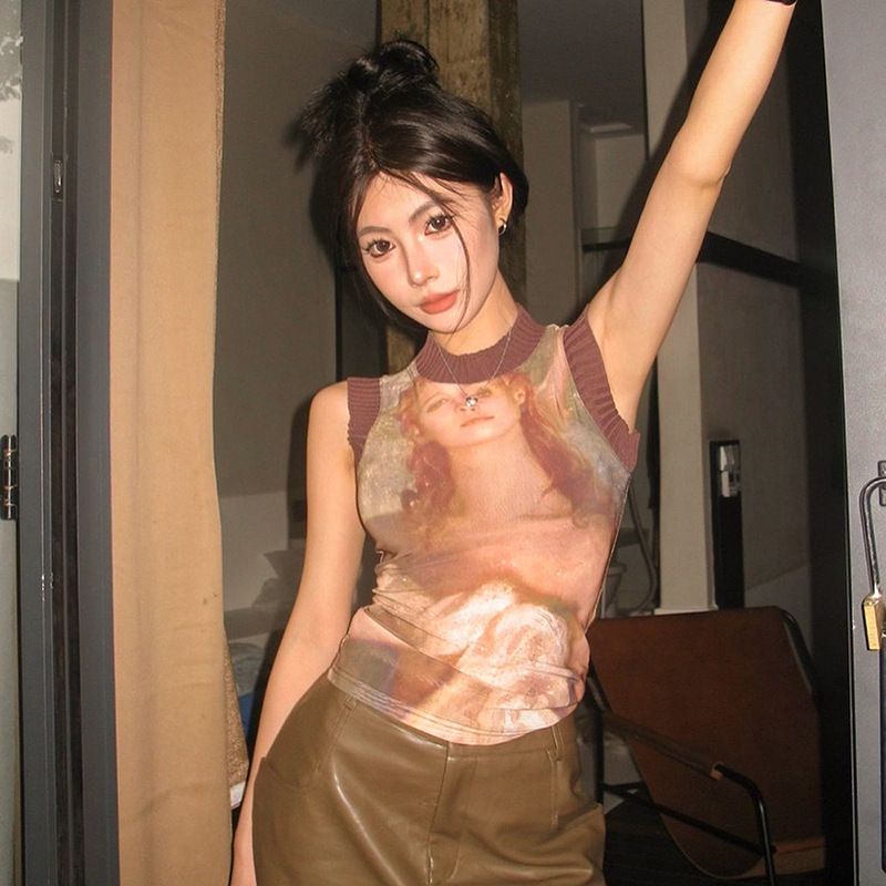 Q23TP7782024 Top de malla sin mangas con cuello redondo y estampado nuevo para mujer primavera/verano