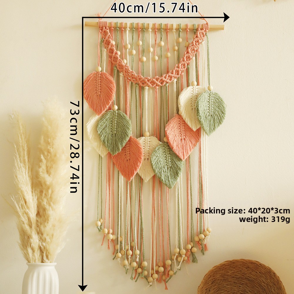 Tapiz bohemio hecho a mano de algodón tejido con cuentas de madera y hojas, decoración sencilla para pared del hogar, dormitorio y casa de familia.
