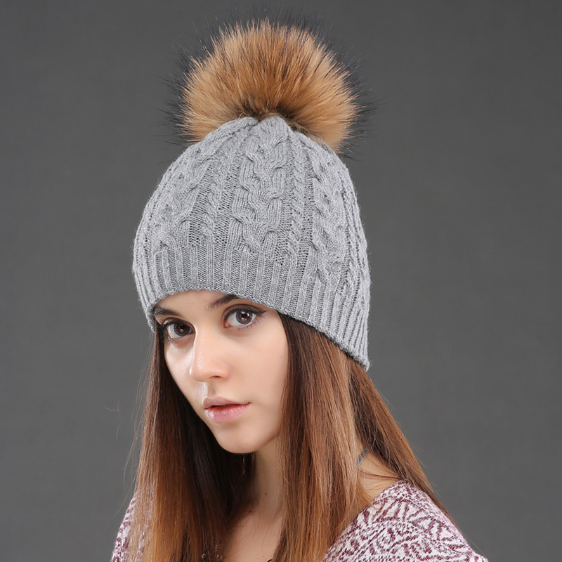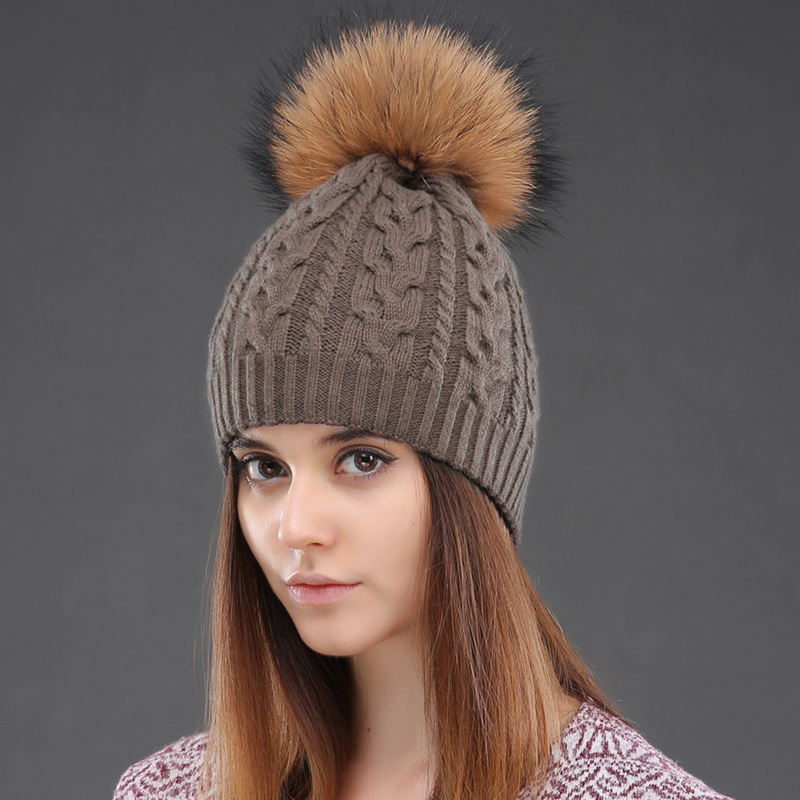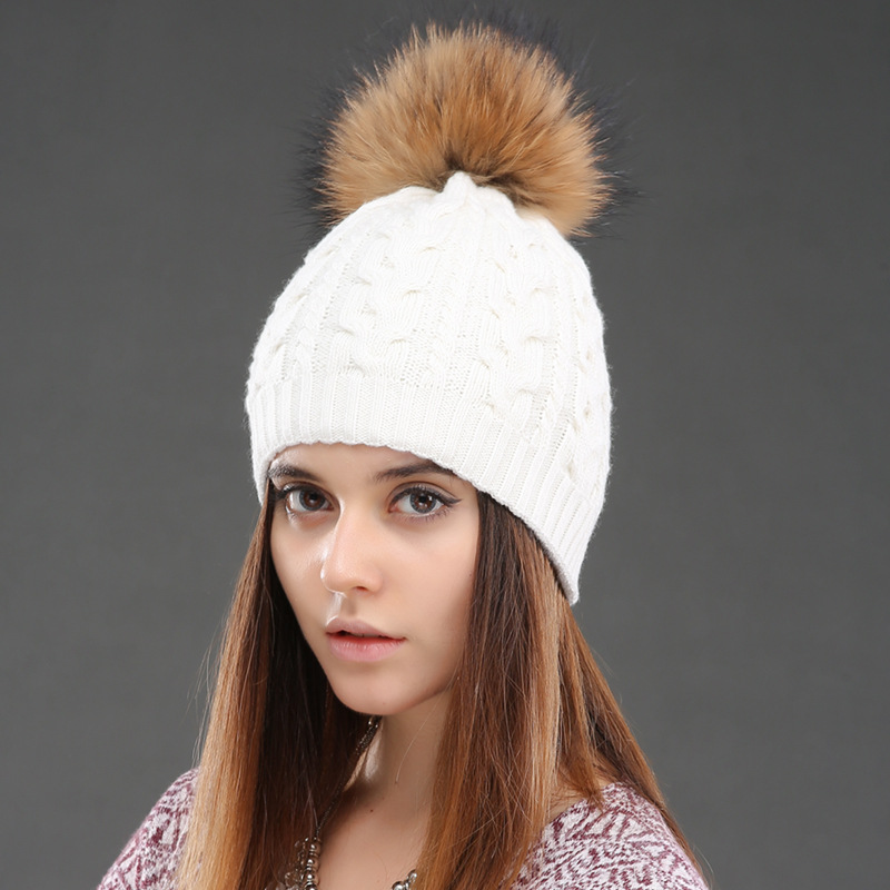 Wool hat women's double-layer winter warm Fried Dough Twists knitting pullover hat real raccoon dog wool ball wool hat