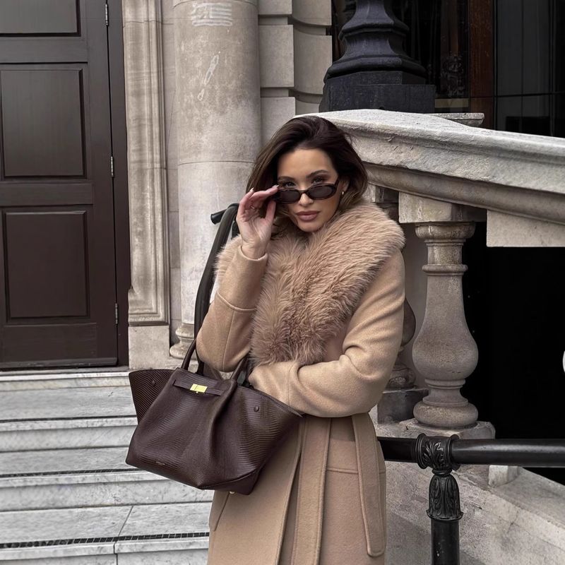 ZA2025 Women's Fashion Autumn Winter New Large Fur Collar Long Woolen Lace-Up Coat Jacket